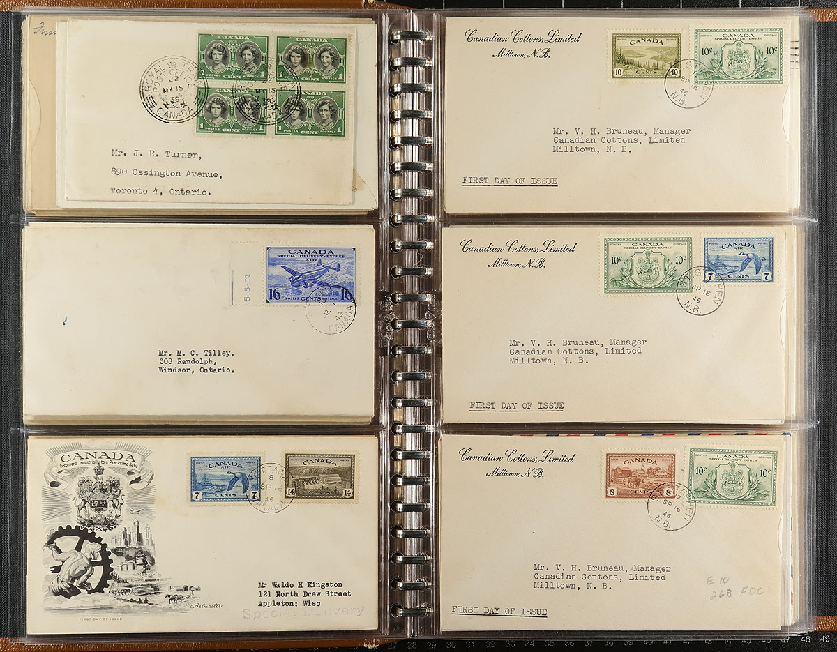 First Day Covers. An old-time FDC album, filled with 150 primarily private cachet FDC from the 1932-1977 period. Includes many better, with "back of the book" Airmails, 1932 Medallion, 1933 Royal William, 1934 Jacques Cartier, 1935 Silver Jubilee, George VI (various, including better 1946 Peace issue), early QEII and a set of the 1967 QEII Centennial mid/high-values. A bit of foxing on some of the 1950's issues, but overall a very useful offering. Estimate =