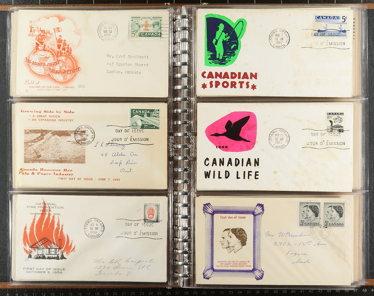 First Day Covers. An old-time FDC album, filled with 150 primarily private cachet FDC from the 1932-1977 period. Includes many better, with "back of the book" Airmails, 1932 Medallion, 1933 Royal William, 1934 Jacques Cartier, 1935 Silver Jubilee, George VI (various, including better 1946 Peace issue), early QEII and a set of the 1967 QEII Centennial mid/high-values. A bit of foxing on some of the 1950's issues, but overall a very useful offering. Estimate =