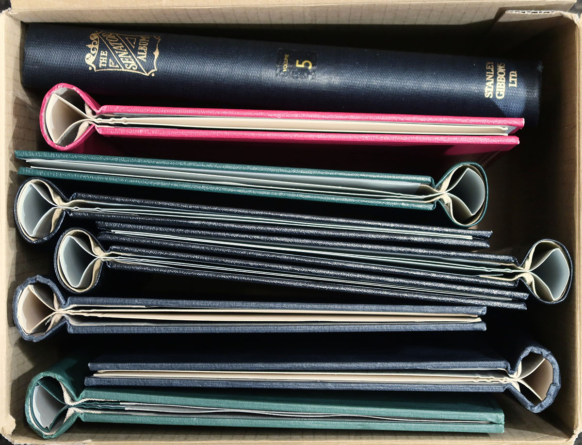 Stanley Gibbons Springback Albums. A very lightly used assembly of Stanley Gibbons brand springback albums in black, red and green. Branded as (mostly) the "Senator" and "Utile" albums, these albums hold a special place in philatelic history, always appreciated by those who still use this classic album format. Estimate =