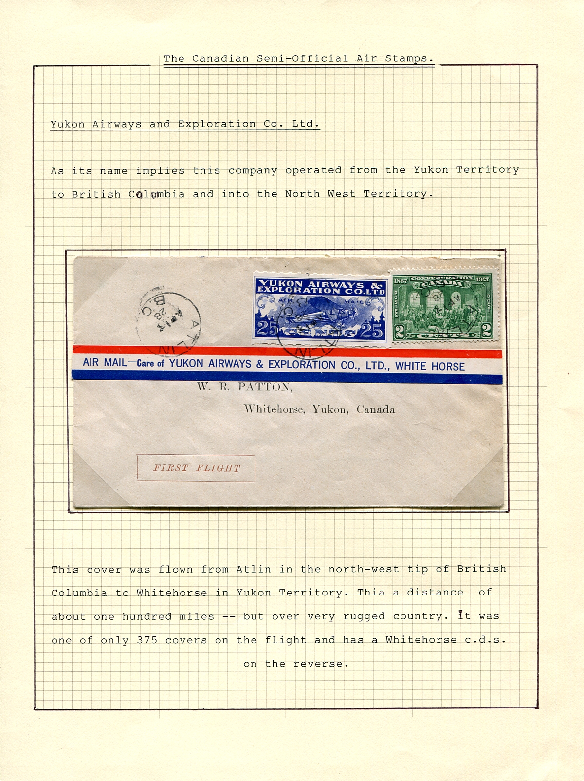 A trio of First Flight Covers, all dated 1928 and featuring the Yukon Airways and Exploration Ltd, semi-official airmail stamp. Includes Flights between Atlin to Whitehorse, Carcross to Whitehorse and Carcross to Atlin (the latter, Pilot Signed). A very clean offering. 2024 Unitrade =