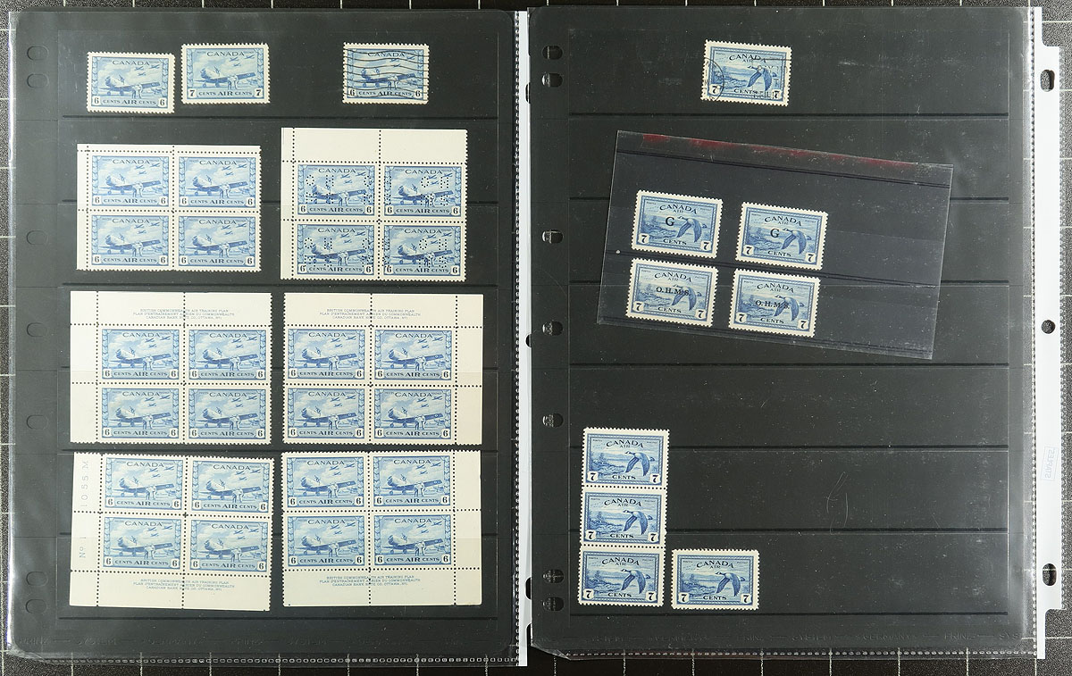 A stunning one man's collection of (mostly) mint and used Airmail / Special Delivery Airmail issues, all neatly arranged on a bakers dozen (13) stockpages. Includes mint singles, blocks, plate inscriptions, plate blocks, used, Officials (including a block of delisted C1 with "O.H.M.S." perfin). Overall condition is excellent, and the catalogue value would add up very quickly here! Offered as received. Estimate =