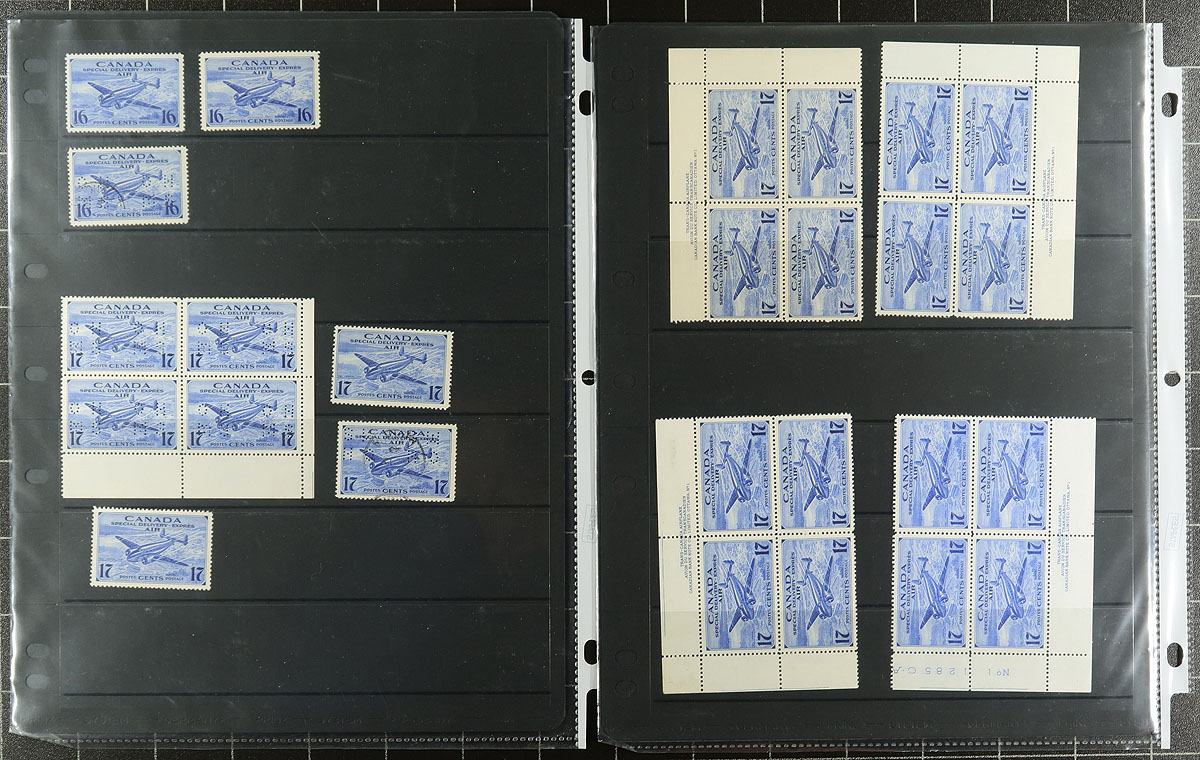 A stunning one man's collection of (mostly) mint and used Airmail / Special Delivery Airmail issues, all neatly arranged on a bakers dozen (13) stockpages. Includes mint singles, blocks, plate inscriptions, plate blocks, used, Officials (including a block of delisted C1 with "O.H.M.S." perfin). Overall condition is excellent, and the catalogue value would add up very quickly here! Offered as received. Estimate =