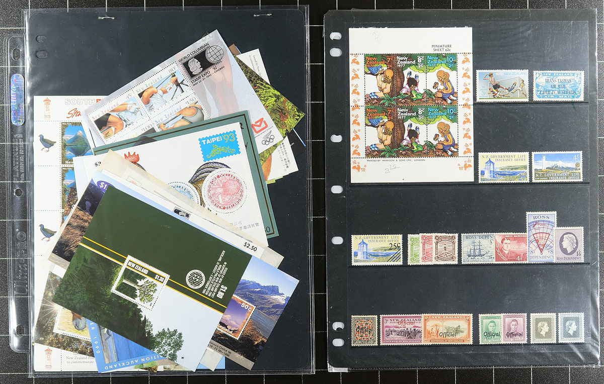 Collection / accumulation of mint New Zealand, 1901-1999, containing roughly 750 stamps in many album or stock pages, along with several sets in 102 cards. The lot generally ranges from Scott #99/1627, with strength from the 1930s onwards, majority seemed mint hinged but did note some never hinged material, along with back of the booko issues, and several souvenir sheets. A spot check indicated a few singles and sets cataloguing $10 an up including #s 229-241 (mh, $58 total), 382-404 (mh, $76 total), and more. Owner's 2013 Scott catalogue value for the lot totals $1,615, face value alone would be several hundreds of dollars. A nicely organized lot with a variety of purposes, overall very fine. Estimate =