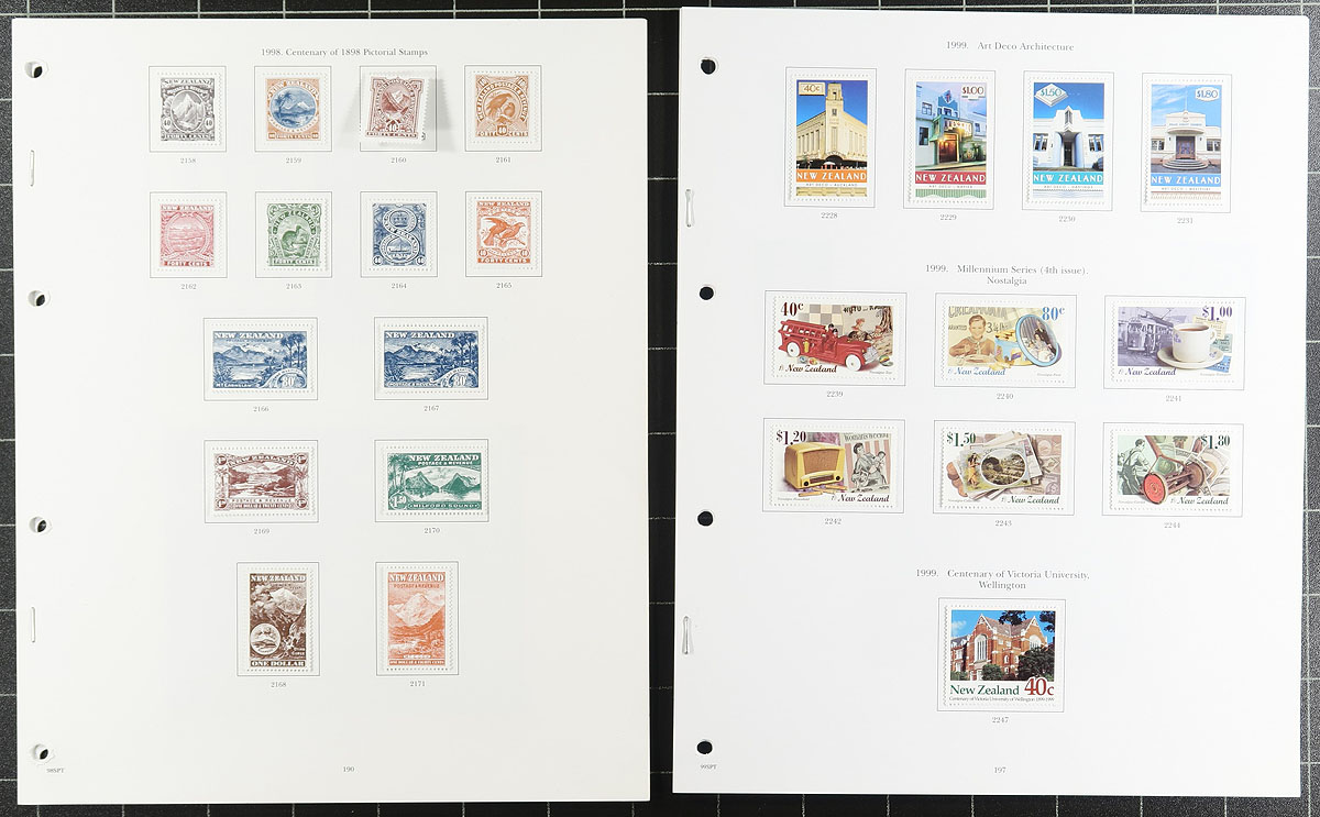 Collection / accumulation of mint New Zealand, 1901-1999, containing roughly 750 stamps in many album or stock pages, along with several sets in 102 cards. The lot generally ranges from Scott #99/1627, with strength from the 1930s onwards, majority seemed mint hinged but did note some never hinged material, along with back of the booko issues, and several souvenir sheets. A spot check indicated a few singles and sets cataloguing $10 an up including #s 229-241 (mh, $58 total), 382-404 (mh, $76 total), and more. Owner's 2013 Scott catalogue value for the lot totals $1,615, face value alone would be several hundreds of dollars. A nicely organized lot with a variety of purposes, overall very fine. Estimate =