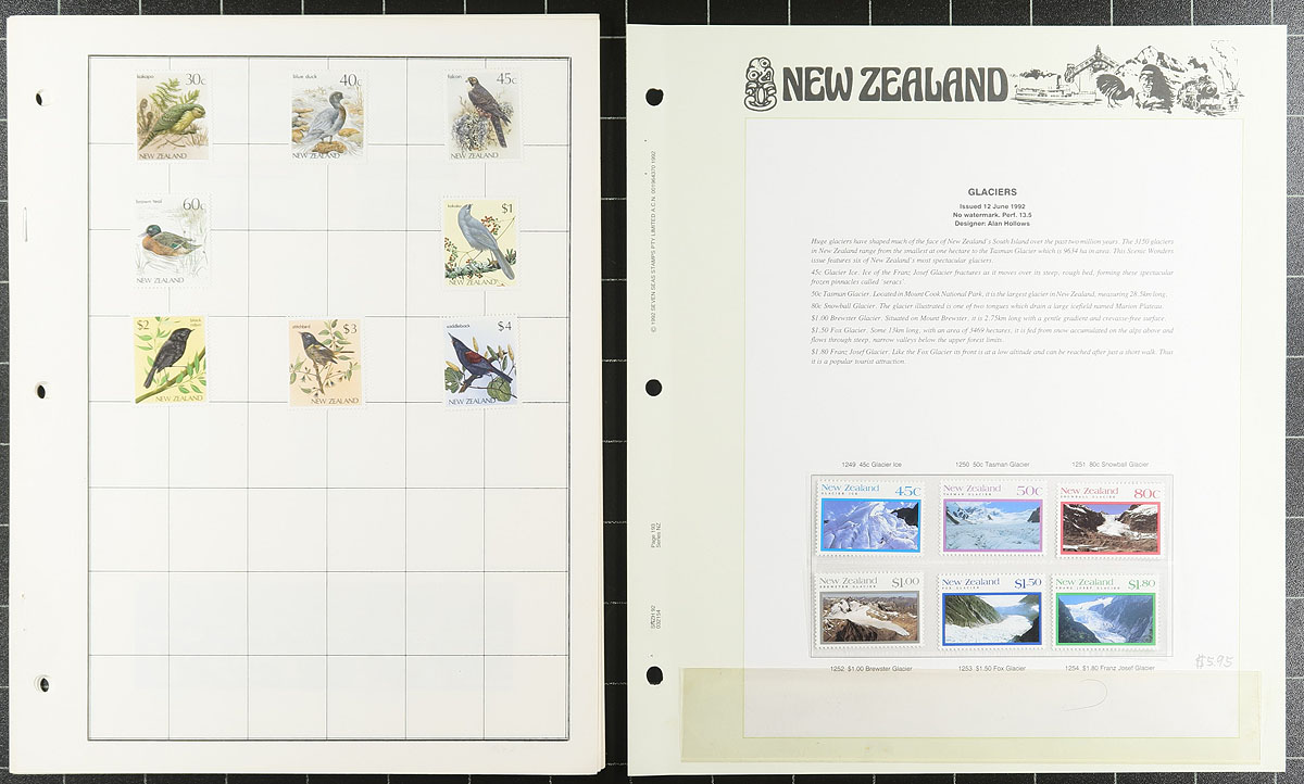 Collection / accumulation of mint New Zealand, 1901-1999, containing roughly 750 stamps in many album or stock pages, along with several sets in 102 cards. The lot generally ranges from Scott #99/1627, with strength from the 1930s onwards, majority seemed mint hinged but did note some never hinged material, along with back of the booko issues, and several souvenir sheets. A spot check indicated a few singles and sets cataloguing $10 an up including #s 229-241 (mh, $58 total), 382-404 (mh, $76 total), and more. Owner's 2013 Scott catalogue value for the lot totals $1,615, face value alone would be several hundreds of dollars. A nicely organized lot with a variety of purposes, overall very fine. Estimate =