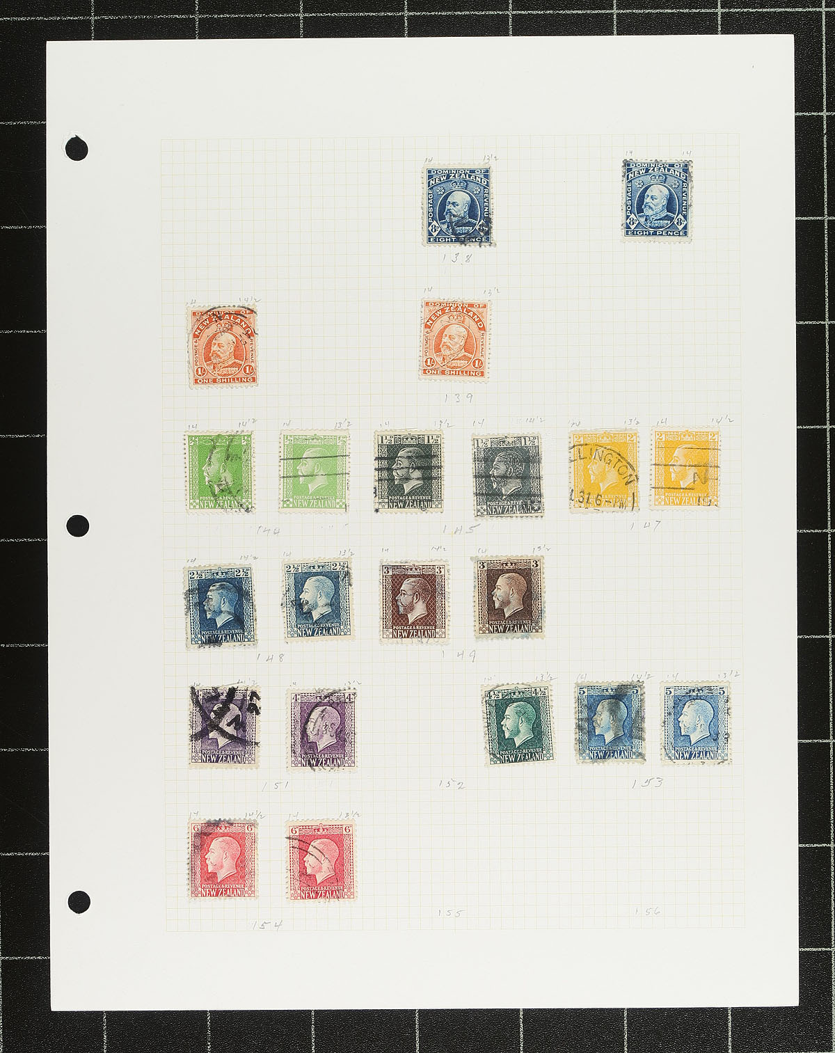 Collection of used New Zealand, 1862-1999, containing many hundreds of stamps in over 100 homemade pages, and several 102 cards. The lot generally ranges from Scott #12/1583, beginning with a few Charlon Heads including #s 12, 32-33, 40a, 41-42, and continues with singles, sets, and partial sets, including some perforation varieties, back of the book material, etc., with some material cataloguing $10 and up. Owner's 2014 Scott catalogue value for the lot totals $1,940. Postmark interest includes squared circles, cds, and a few other types including a few "socked on the nose" town cancels. A good lot that should be developed further, a few small faults with the early stamps, overall fine to very fine. Estimate =