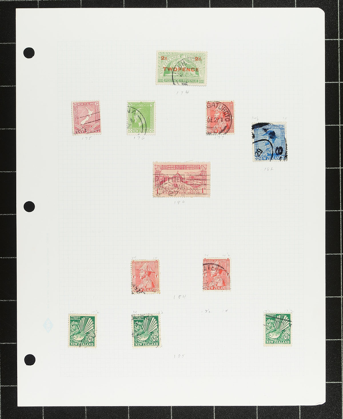 Collection of used New Zealand, 1862-1999, containing many hundreds of stamps in over 100 homemade pages, and several 102 cards. The lot generally ranges from Scott #12/1583, beginning with a few Charlon Heads including #s 12, 32-33, 40a, 41-42, and continues with singles, sets, and partial sets, including some perforation varieties, back of the book material, etc., with some material cataloguing $10 and up. Owner's 2014 Scott catalogue value for the lot totals $1,940. Postmark interest includes squared circles, cds, and a few other types including a few "socked on the nose" town cancels. A good lot that should be developed further, a few small faults with the early stamps, overall fine to very fine. Estimate =