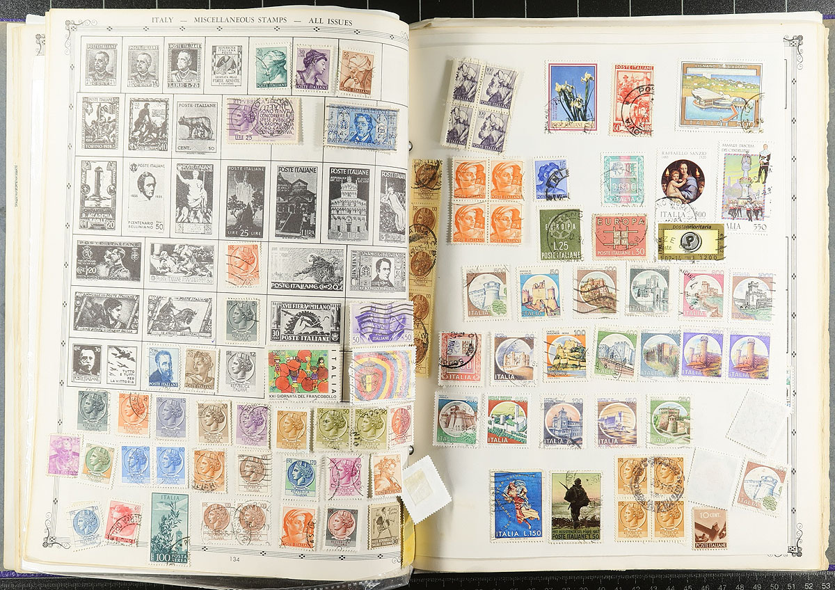 Hodgepodge of many thousands of worldwide stamps filling a uhaul carton, in a variety of formats, including several albums, stock pages, glassines and more. The material generally ranges from the 1890's to the 1970's, with better representation from European and British Commonwealth countries. Completely unchecked for catalogue values, leaving various finds and possibilities for the diligent collector. Fairly organized for a lot of this type, overall fine to very fine. Estimate =