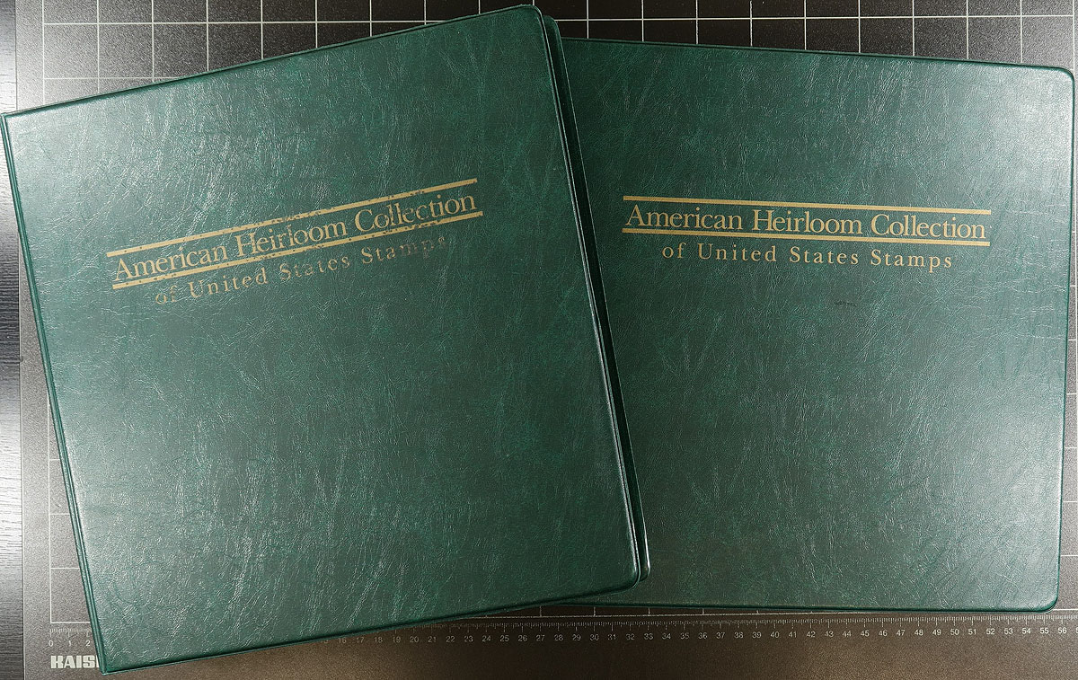 United States album pages "American Heirloom Collection of United States Stamps", in two volumes, with album pages for years 1847-1992, along with back of the book material and includes spaces for blocks and souvenir sheets. Gently used and waiting for a new owner. Estimate =