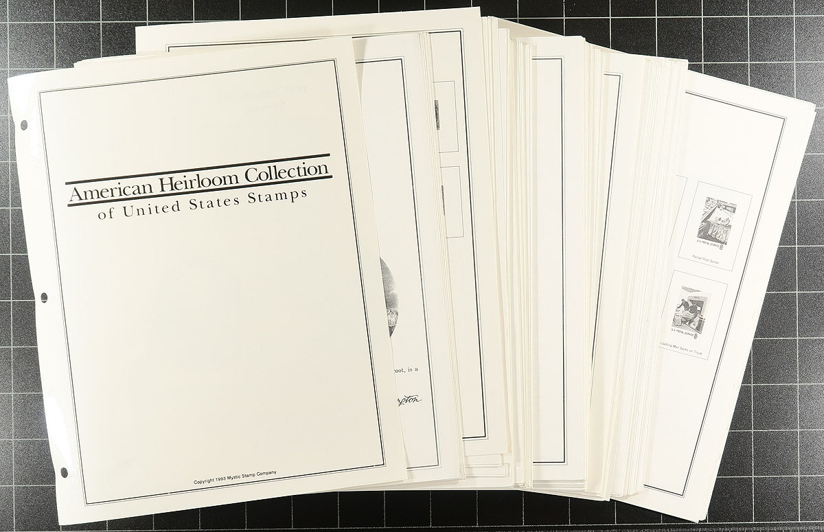 United States album pages "American Heirloom Collection of United States Stamps", in two volumes, with album pages for years 1847-1992, along with back of the book material and includes spaces for blocks and souvenir sheets. Gently used and waiting for a new owner. Estimate =