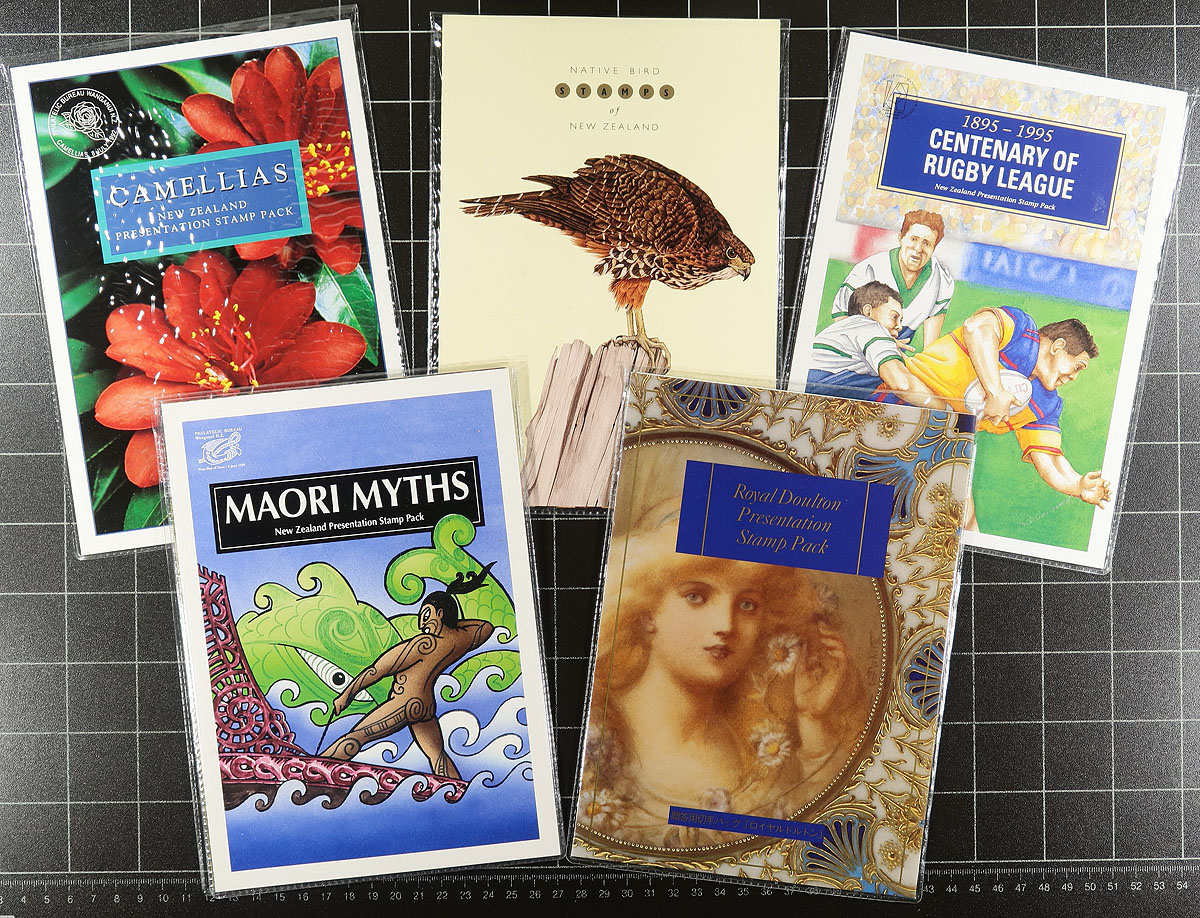 Group of never hinged New Zealand annual collections and presentation packs, 1980's-2000's, containing 25 items in total, including annual collections from years 1984-1987, 1998, 2008, along with several presentation packs which would be ideal for topical and thematic collectors. A very fine and clean lot. Estimate =