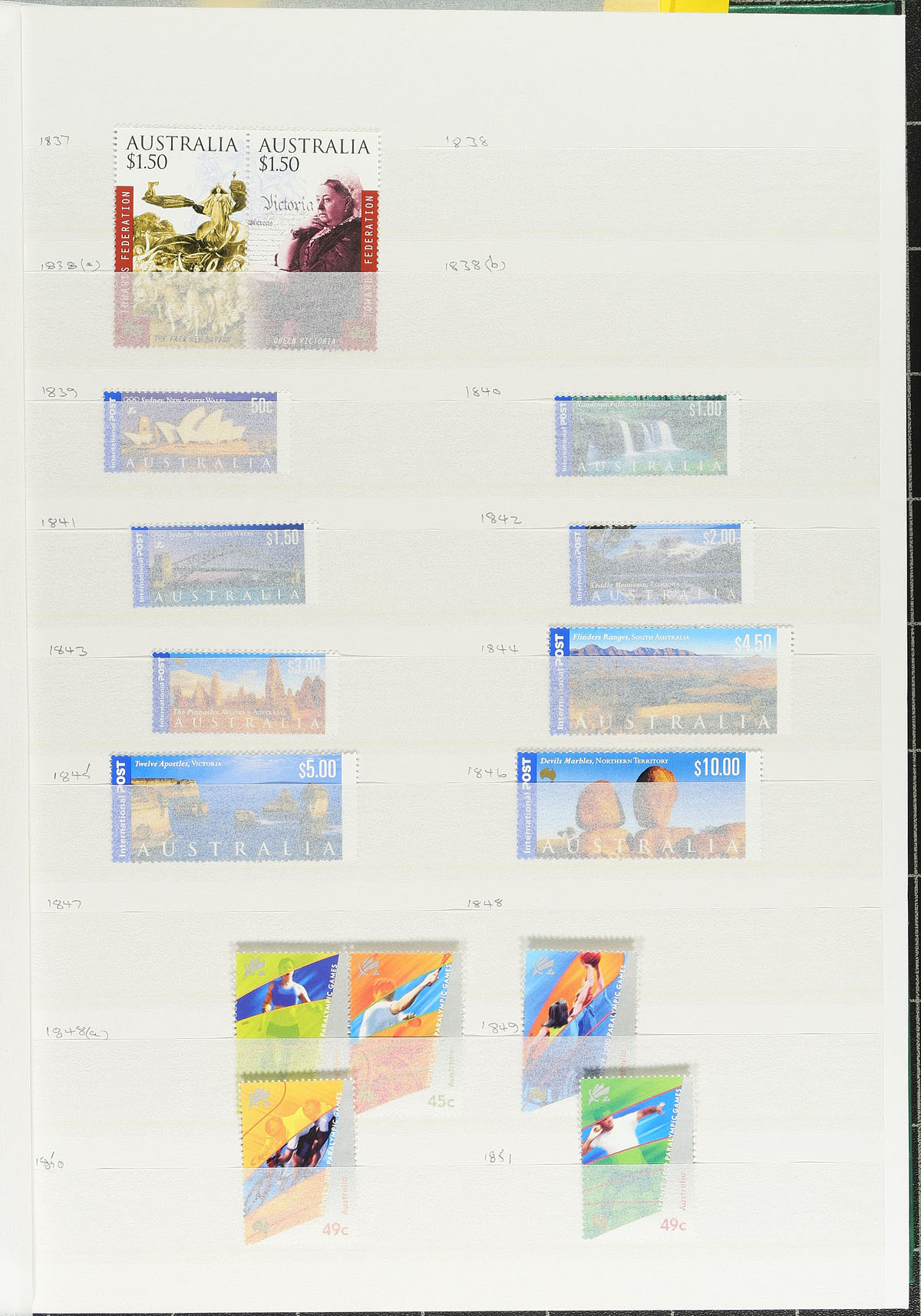 Collection Part 1. Lovely never hinged collection of modern Australia, 2000-2006, in a thick 64 page stockbook, containing several hundreds of stamps, along with blocks, booklet panes, and sheetlets. This neatly organized collection ranges from Scott #1817/2636, with spots made available for missing issues, noting sets, booklets, and souvenir sheets cataloguing from $8 to $15 and up each. Face value alone totaling $535.00. A super clean lot, that should be filled and enjoyed by all collectors. Very fine. 2026 Scott US$1,039.00 =