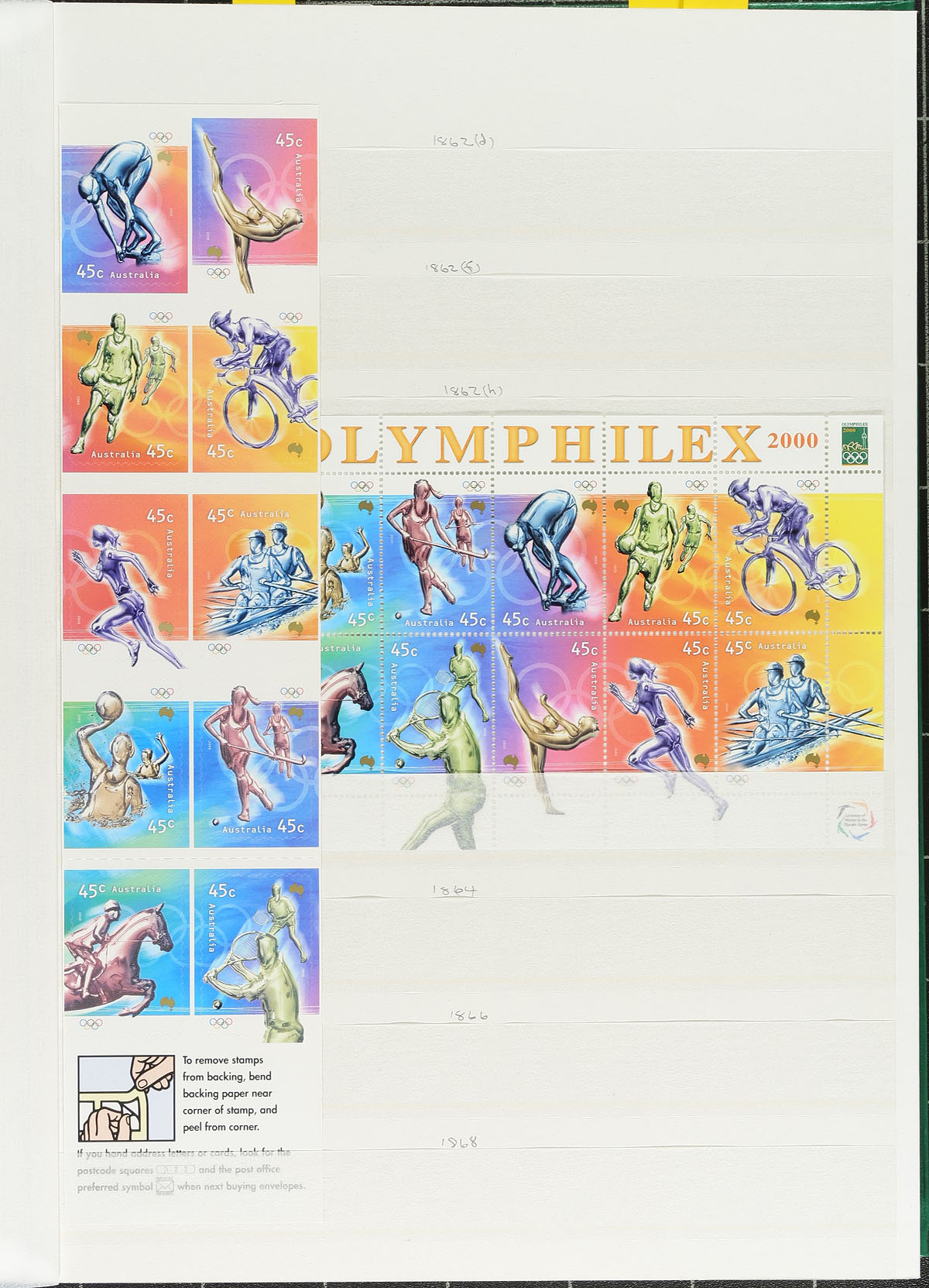 Collection Part 1. Lovely never hinged collection of modern Australia, 2000-2006, in a thick 64 page stockbook, containing several hundreds of stamps, along with blocks, booklet panes, and sheetlets. This neatly organized collection ranges from Scott #1817/2636, with spots made available for missing issues, noting sets, booklets, and souvenir sheets cataloguing from $8 to $15 and up each. Face value alone totaling $535.00. A super clean lot, that should be filled and enjoyed by all collectors. Very fine. 2026 Scott US$1,039.00 =