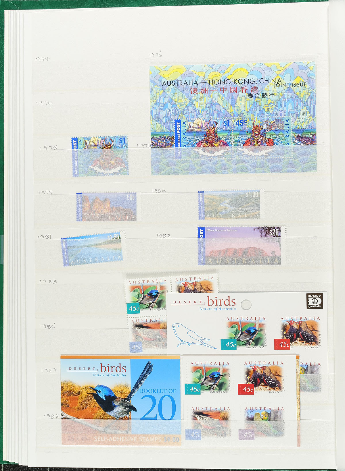 Collection Part 1. Lovely never hinged collection of modern Australia, 2000-2006, in a thick 64 page stockbook, containing several hundreds of stamps, along with blocks, booklet panes, and sheetlets. This neatly organized collection ranges from Scott #1817/2636, with spots made available for missing issues, noting sets, booklets, and souvenir sheets cataloguing from $8 to $15 and up each. Face value alone totaling $535.00. A super clean lot, that should be filled and enjoyed by all collectors. Very fine. 2026 Scott US$1,039.00 =