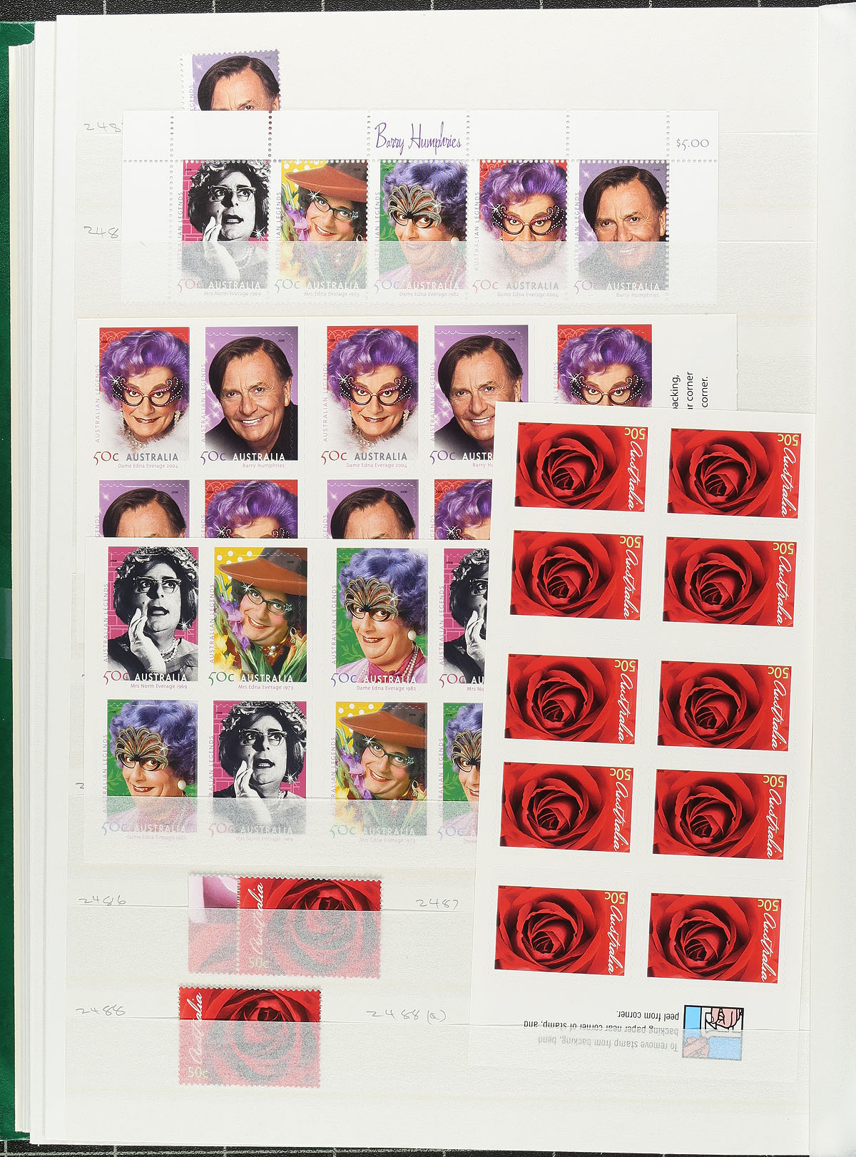 Collection Part 1. Lovely never hinged collection of modern Australia, 2000-2006, in a thick 64 page stockbook, containing several hundreds of stamps, along with blocks, booklet panes, and sheetlets. This neatly organized collection ranges from Scott #1817/2636, with spots made available for missing issues, noting sets, booklets, and souvenir sheets cataloguing from $8 to $15 and up each. Face value alone totaling $535.00. A super clean lot, that should be filled and enjoyed by all collectors. Very fine. 2026 Scott US$1,039.00 =