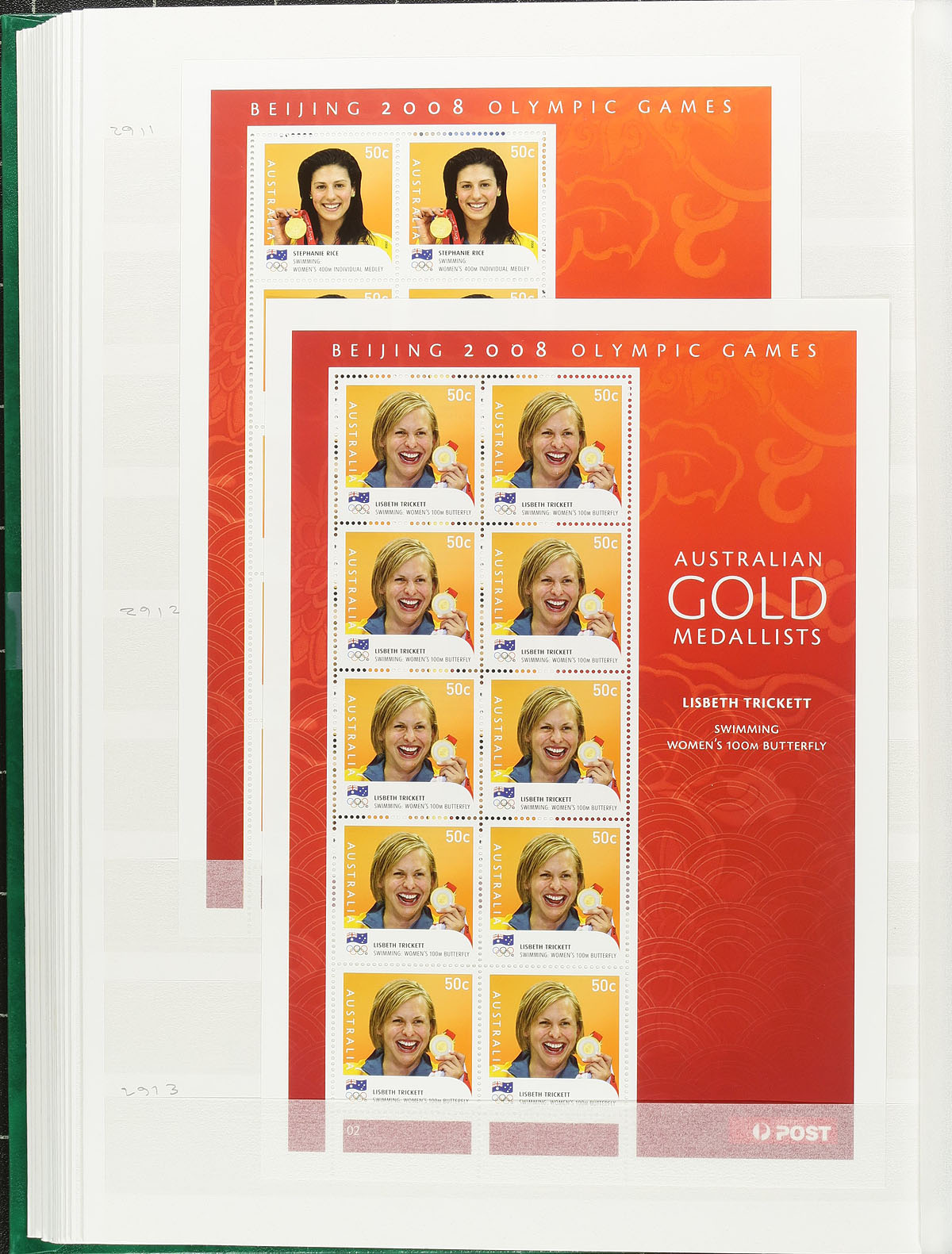 Collection Part 2. Lovely never hinged collection of modern Australia, 2006-2008, in a thick 64 page stockbook, containing several hundreds of stamps, along with blocks, booklet panes, and sheetlets. This neatly organized collection ranges from Scott #2540/2958, with spots made available for missing issues, noting sets, booklets, and souvenir sheets cataloguing from $8 to $15 and up each. Face value alone totaling $453. A super clean lot, that should be filled and enjoyed by all collectors. Very fine. 2026 Scott US$811.00 =