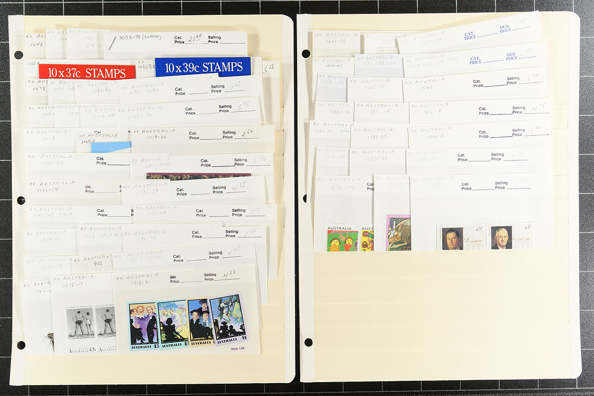 Dealer stock of mint Australia, 1967-1994, containing many hundreds of stamps in several hundred 102 cards in 4 counter books, and neatly arranged in a handful of stock pages. The lot ranges from Scott #429/1380, with each card containing a single or set, with each card identified by Scott number along with retail or catalogue pricing. Owner's Scott or catalogue pricing for the lot totals US$1,307.00. A bit of duplication noted for some issues, with a mix of mint hinged and never hinged throughout. A nice lot for dealers or collectors alike. Estimate =