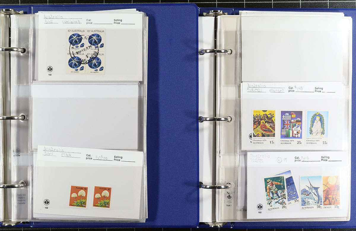 Dealer stock of mint Australia, 1967-1994, containing many hundreds of stamps in several hundred 102 cards in 4 counter books, and neatly arranged in a handful of stock pages. The lot ranges from Scott #429/1380, with each card containing a single or set, with each card identified by Scott number along with retail or catalogue pricing. Owner's Scott or catalogue pricing for the lot totals US$1,307.00. A bit of duplication noted for some issues, with a mix of mint hinged and never hinged throughout. A nice lot for dealers or collectors alike. Estimate =