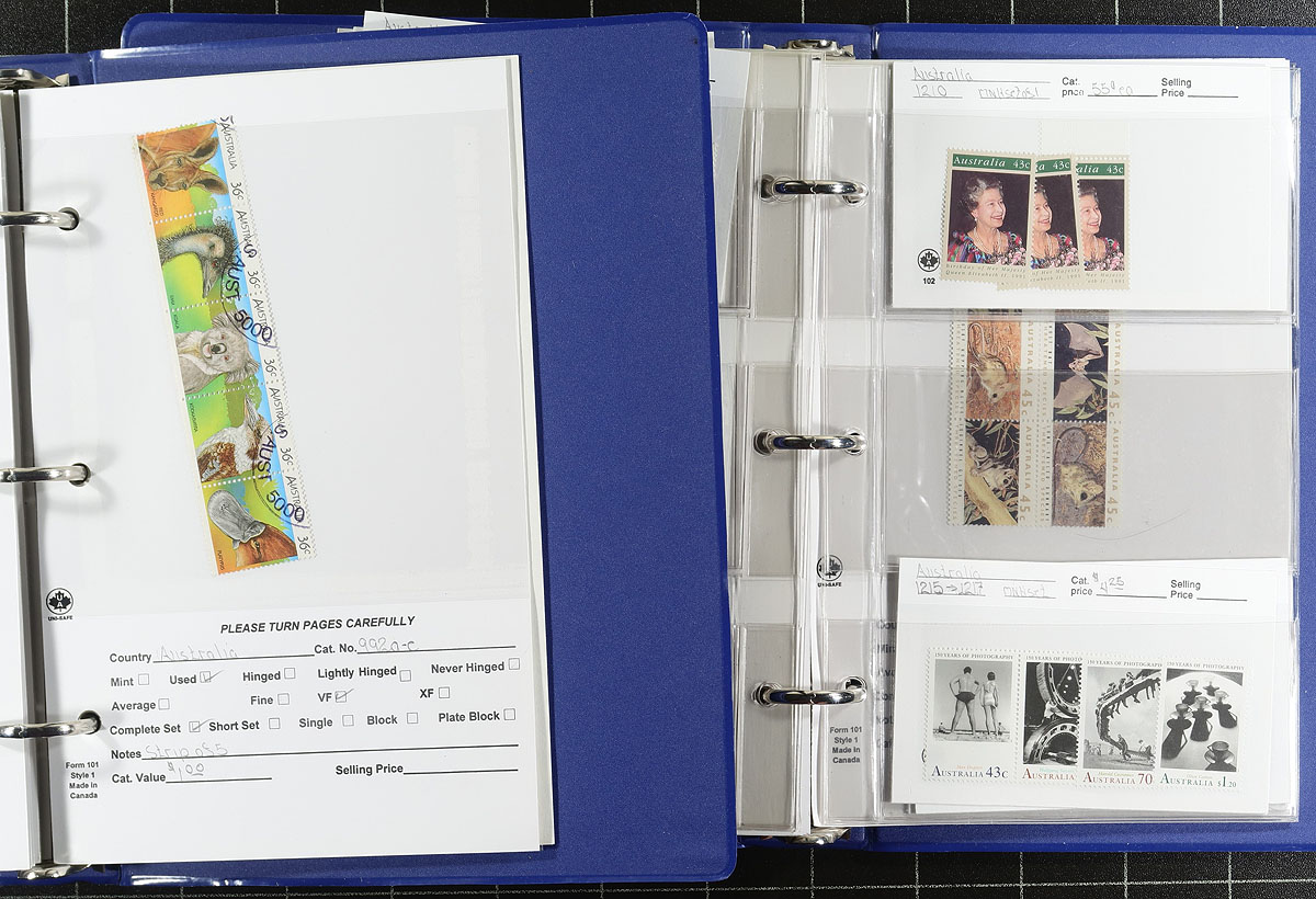 Dealer stock of mint Australia, 1967-1994, containing many hundreds of stamps in several hundred 102 cards in 4 counter books, and neatly arranged in a handful of stock pages. The lot ranges from Scott #429/1380, with each card containing a single or set, with each card identified by Scott number along with retail or catalogue pricing. Owner's Scott or catalogue pricing for the lot totals US$1,307.00. A bit of duplication noted for some issues, with a mix of mint hinged and never hinged throughout. A nice lot for dealers or collectors alike. Estimate =