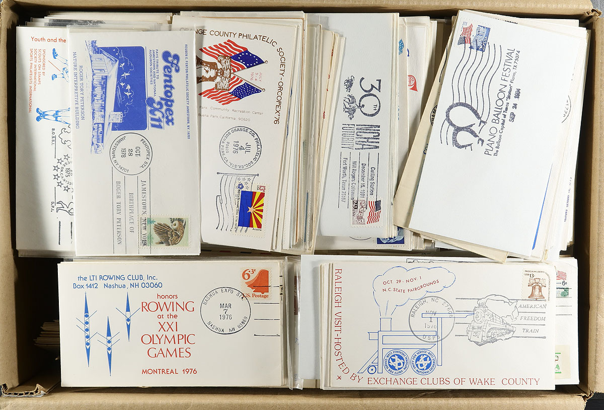 Nice accumulation of roughly 900 United States covers, 1930's-1990's, noting a really interesting array of material, notably special event covers including exhibitions, State fairs, military commemorative covers, State day's, stamp club show covers, and so much more. Almost all the covers have special made cachets, or pictorial cancels that relate to the specific event. A nice lot as some of these might have been printed in limited quantities, ideal for collectors and dealers looking to fill dollar boxes. Some mild duplication encountered for a few covers, overall fine to very fine. Estimate =