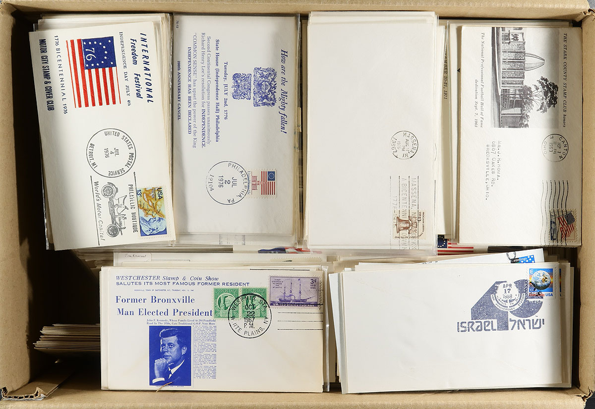 Nice accumulation of roughly 900 United States covers, 1930's-1990's, noting a really interesting array of material, notably special event covers including exhibitions, State fairs, military commemorative covers, State day's, stamp club show covers, and so much more. Almost all the covers have special made cachets, or pictorial cancels that relate to the specific event. A nice lot as some of these might have been printed in limited quantities, ideal for collectors and dealers looking to fill dollar boxes. Some mild duplication encountered for a few covers, overall fine to very fine. Estimate =