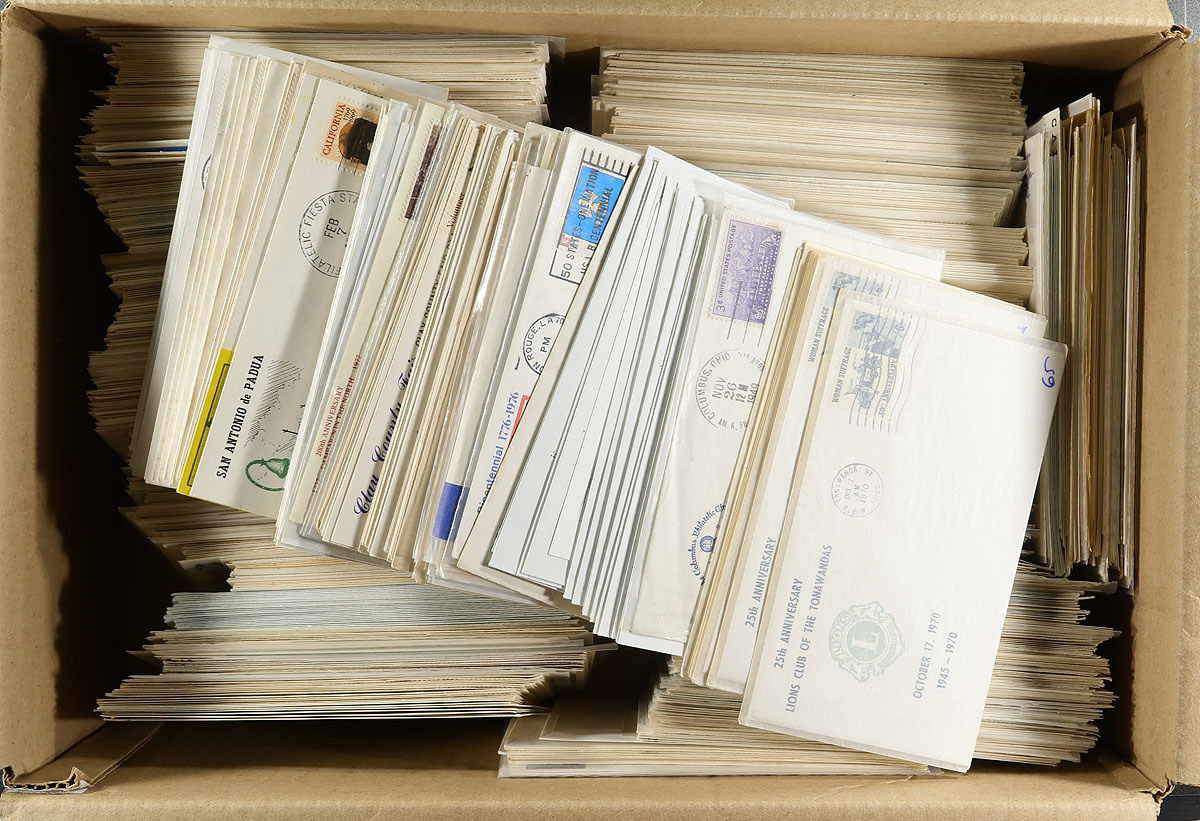 Nice accumulation of roughly 900 United States covers, 1930's-1990's, noting a really interesting array of material, notably special event covers including exhibitions, State fairs, military commemorative covers, State day's, stamp club show covers, and so much more. Almost all the covers have special made cachets, or pictorial cancels that relate to the specific event. A nice lot as some of these might have been printed in limited quantities, ideal for collectors and dealers looking to fill dollar boxes. Some mild duplication encountered for a few covers, overall fine to very fine. Estimate =