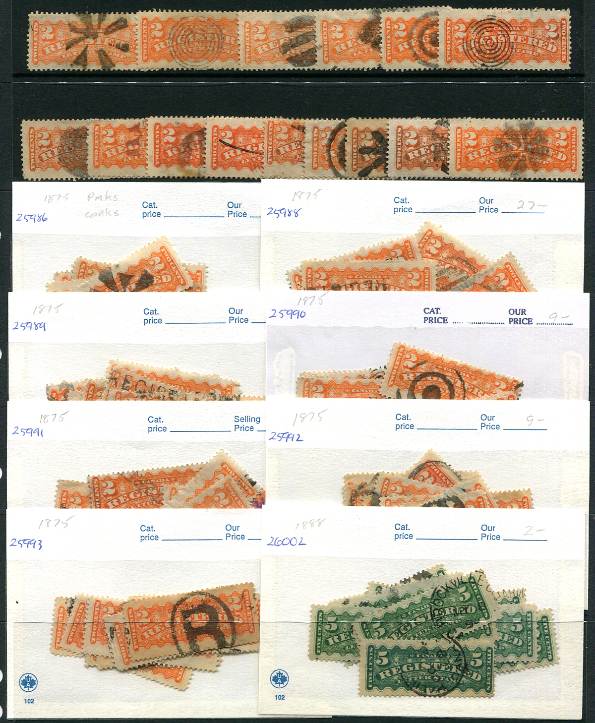 An old-time hoard of 96x F1 and 8x F2, used Registered Letter Stamps. Totally unchecked for shades, perfs, postmarks and varieties. Arranged on a couple stockpages, plus "102" cards. While there will be the odd small fault, this represents an excellent opportunity to acquire a larger holding of these popular stamps. Estimate =