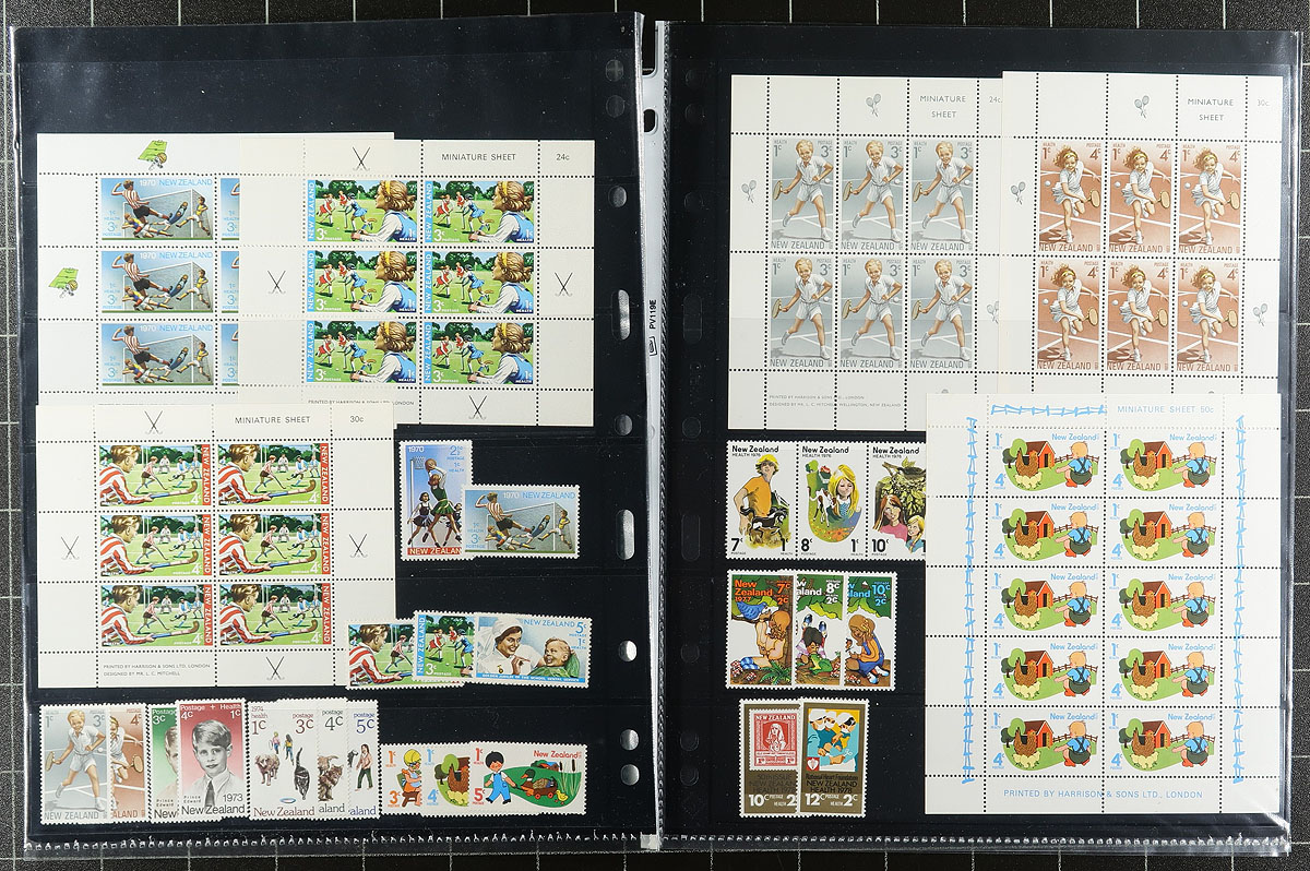 Clean collection of mint New Zealand semi-postal "Health" issues, 1943-1985, containing a few hundred stamps in a few stock pages. The collection ranges from Scott #B22/B123, noting sets and many souvenir sheets, noting a few items cataloguing $15 and up, and includes a mix of hinged and never hinged material. A nice collection that should be continued, overall fine to very fine. Owner's older 2015 Scott US$507.00 =