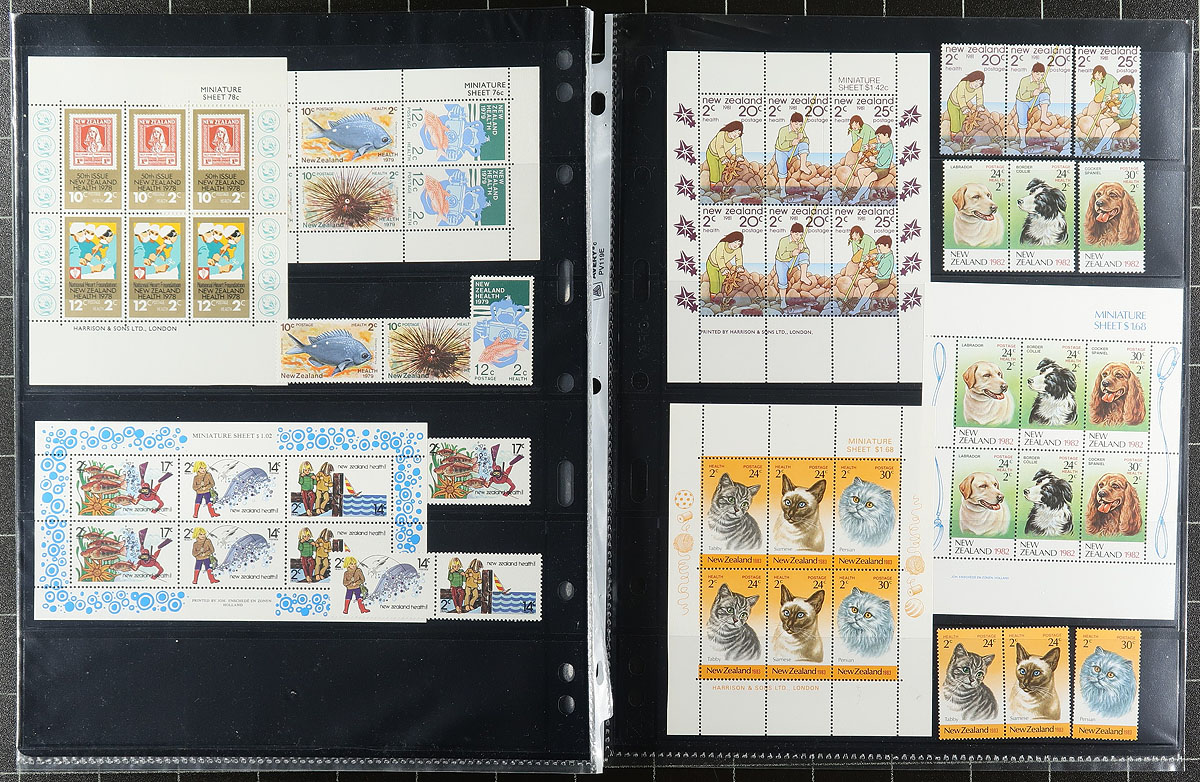 Clean collection of mint New Zealand semi-postal "Health" issues, 1943-1985, containing a few hundred stamps in a few stock pages. The collection ranges from Scott #B22/B123, noting sets and many souvenir sheets, noting a few items cataloguing $15 and up, and includes a mix of hinged and never hinged material. A nice collection that should be continued, overall fine to very fine. Owner's older 2015 Scott US$507.00 =
