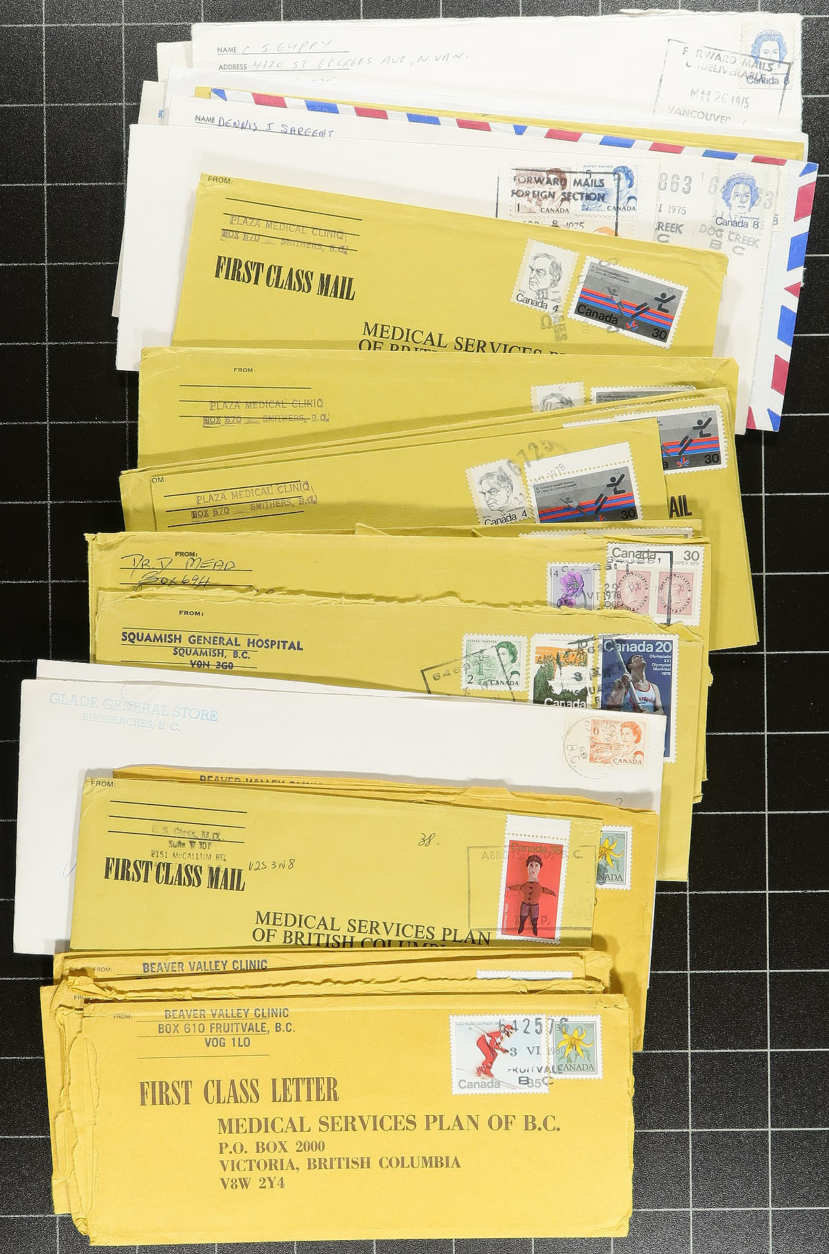 British Columbia. Interesting group of roughly 300 covers collected for British Columbia postmarks, generally ranging from the 1960's to the 1980's, but did spot some earlier material. The group consists of roughly 100 different towns, ranging from A to W, including Dog Creek, Usk, West Grand Forks, Takla Landing, Upper Fraser, Kleena Kleene, and much more. The lot also includes division or section postmarks including "Forward Mails Undeliverable", "Forward Mails Foreign Section", "Despatch Branch", "Air Despatch Branch", and a few others. Postmarks include cds, duplex, machine, several MOON and POCON types, and more. Almost all of the covers are #10 in size, including a few with illustrated corner advertising, some with faults as is the nature of commercial mail, overall a nice lot for the postmark hunter. Estimate =