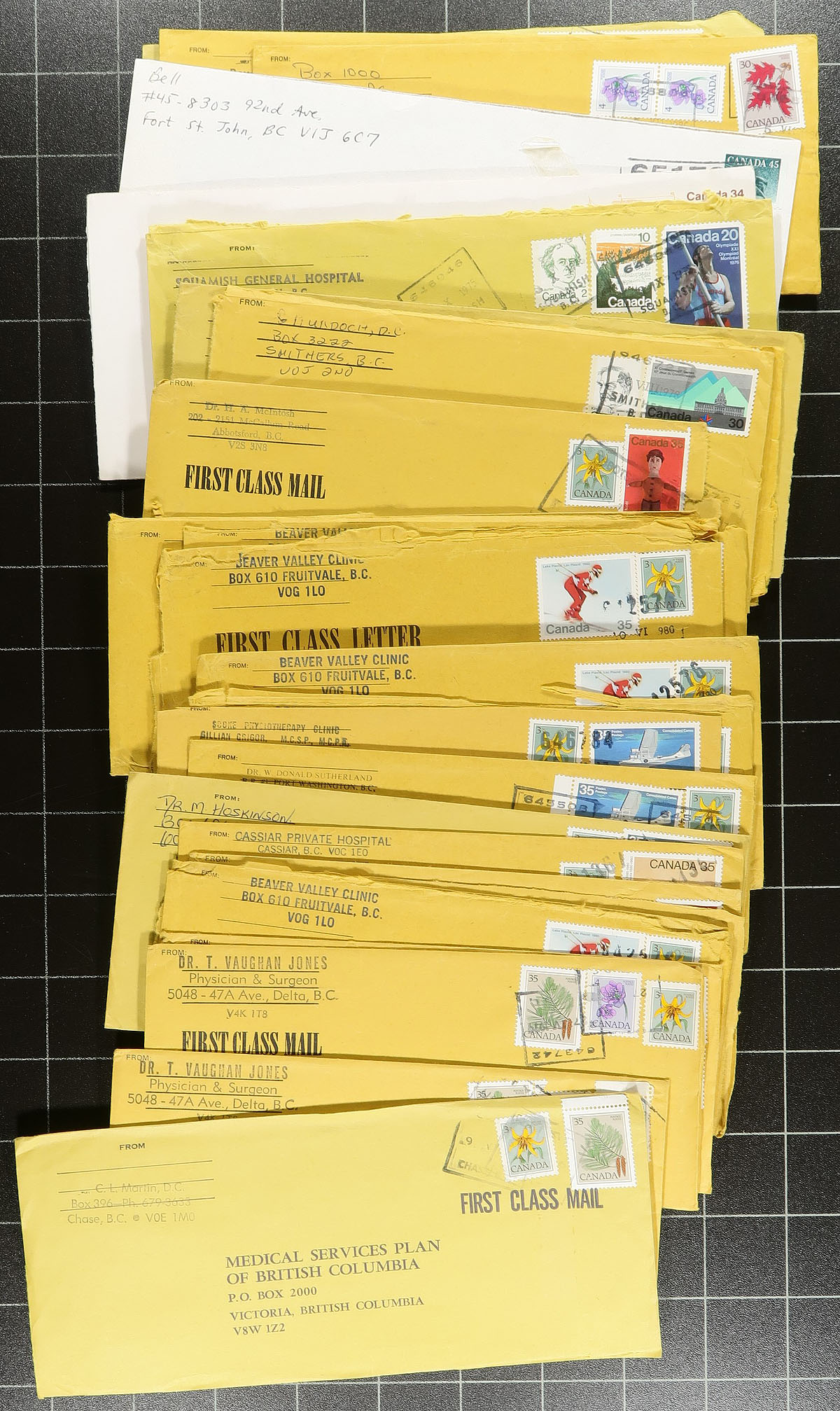 British Columbia. Interesting group of roughly 300 covers collected for British Columbia postmarks, generally ranging from the 1960's to the 1980's, but did spot some earlier material. The group consists of roughly 100 different towns, ranging from A to W, including Dog Creek, Usk, West Grand Forks, Takla Landing, Upper Fraser, Kleena Kleene, and much more. The lot also includes division or section postmarks including "Forward Mails Undeliverable", "Forward Mails Foreign Section", "Despatch Branch", "Air Despatch Branch", and a few others. Postmarks include cds, duplex, machine, several MOON and POCON types, and more. Almost all of the covers are #10 in size, including a few with illustrated corner advertising, some with faults as is the nature of commercial mail, overall a nice lot for the postmark hunter. Estimate =