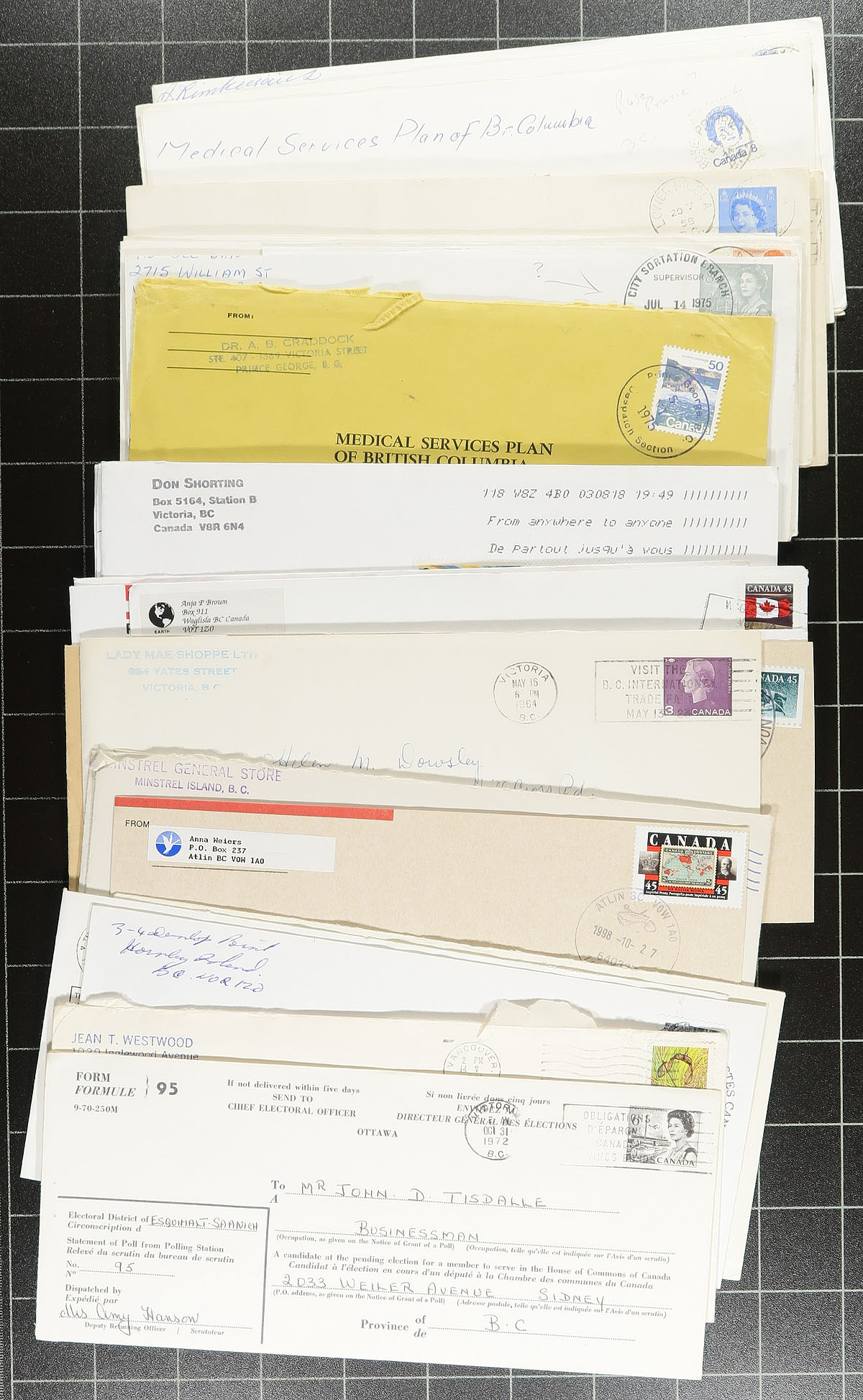 British Columbia. Interesting group of roughly 300 covers collected for British Columbia postmarks, generally ranging from the 1960's to the 1980's, but did spot some earlier material. The group consists of roughly 100 different towns, ranging from A to W, including Dog Creek, Usk, West Grand Forks, Takla Landing, Upper Fraser, Kleena Kleene, and much more. The lot also includes division or section postmarks including "Forward Mails Undeliverable", "Forward Mails Foreign Section", "Despatch Branch", "Air Despatch Branch", and a few others. Postmarks include cds, duplex, machine, several MOON and POCON types, and more. Almost all of the covers are #10 in size, including a few with illustrated corner advertising, some with faults as is the nature of commercial mail, overall a nice lot for the postmark hunter. Estimate =