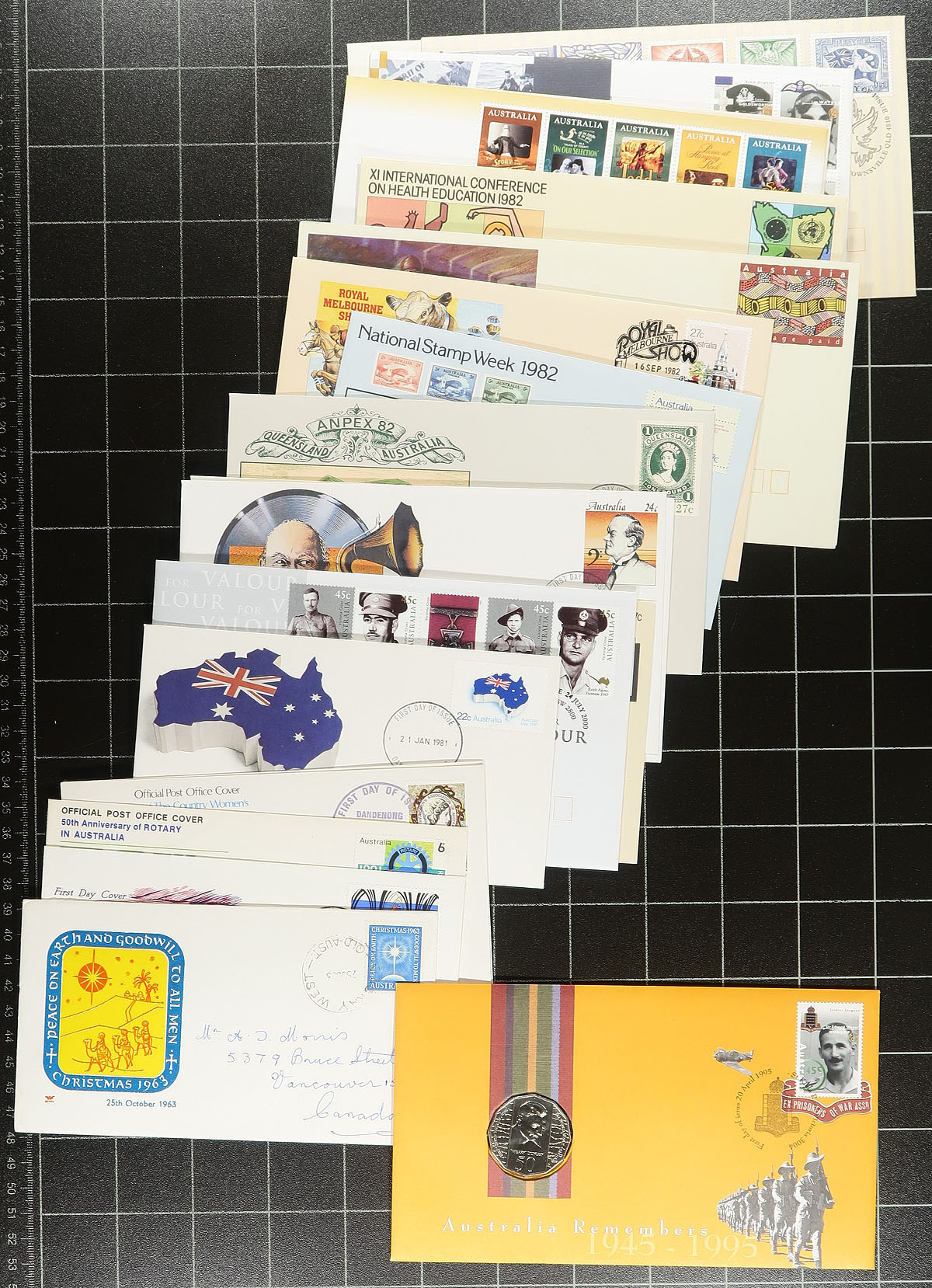 Group of roughly 200 Australia first day covers, 1940-2000's, noting singles, sets, souvenir sheets, and high denomination frankings. Also encountered were a few numismatic covers, and a few interesting bookmarks with first day cover cancellations. A nice lot for cover, topical, and thematic collectors, noting several suitable subjects with colourful cachets. A few corner bends on a few covers, overall fine to very fine. Estimate =
