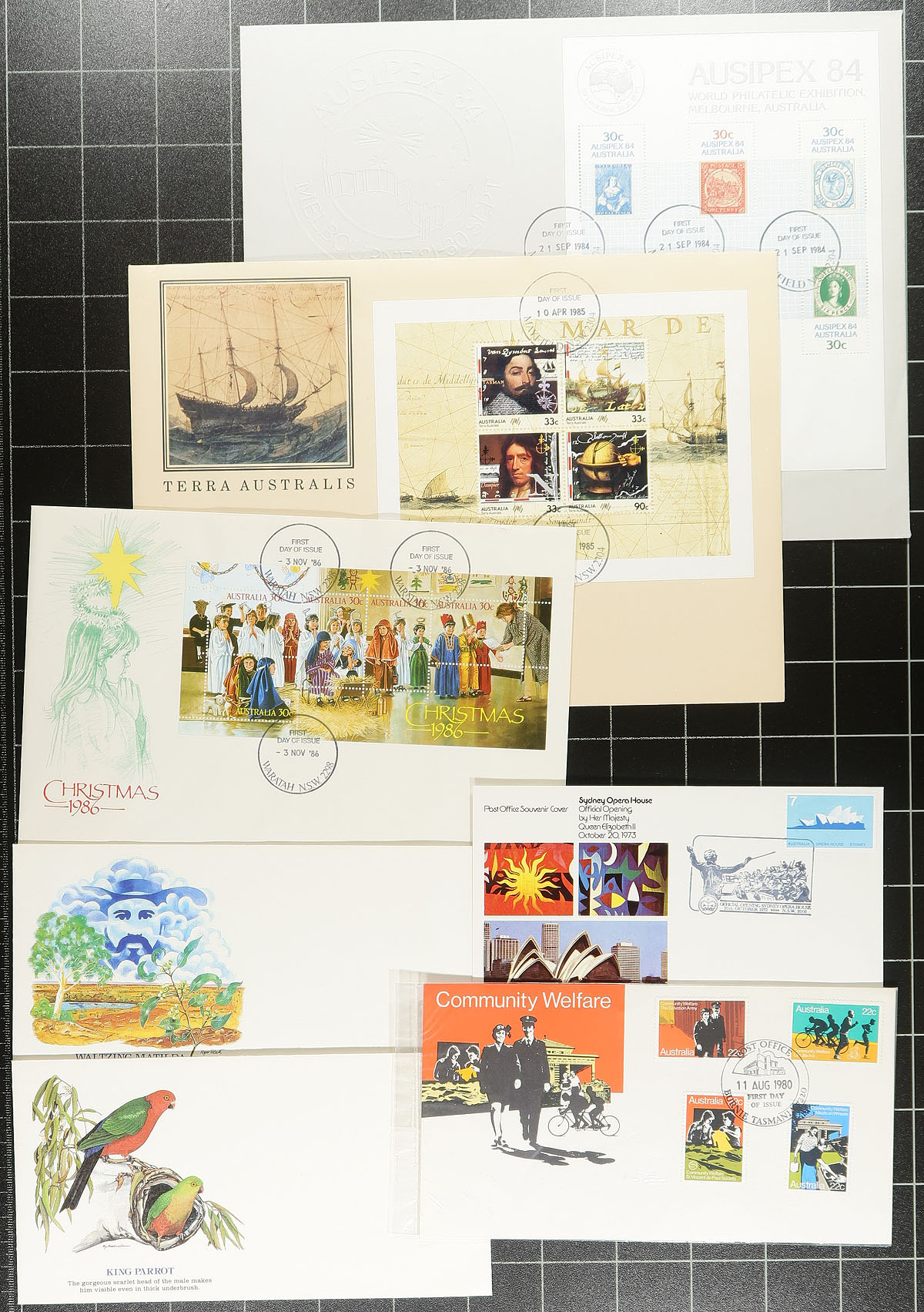 Group of roughly 200 Australia first day covers, 1940-2000's, noting singles, sets, souvenir sheets, and high denomination frankings. Also encountered were a few numismatic covers, and a few interesting bookmarks with first day cover cancellations. A nice lot for cover, topical, and thematic collectors, noting several suitable subjects with colourful cachets. A few corner bends on a few covers, overall fine to very fine. Estimate =