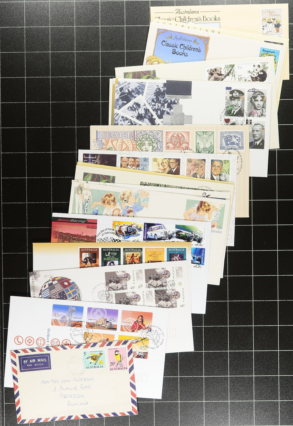 Group of roughly 200 Australia first day covers, 1940-2000's, noting singles, sets, souvenir sheets, and high denomination frankings. Also encountered were a few numismatic covers, and a few interesting bookmarks with first day cover cancellations. A nice lot for cover, topical, and thematic collectors, noting several suitable subjects with colourful cachets. A few corner bends on a few covers, overall fine to very fine. Estimate =