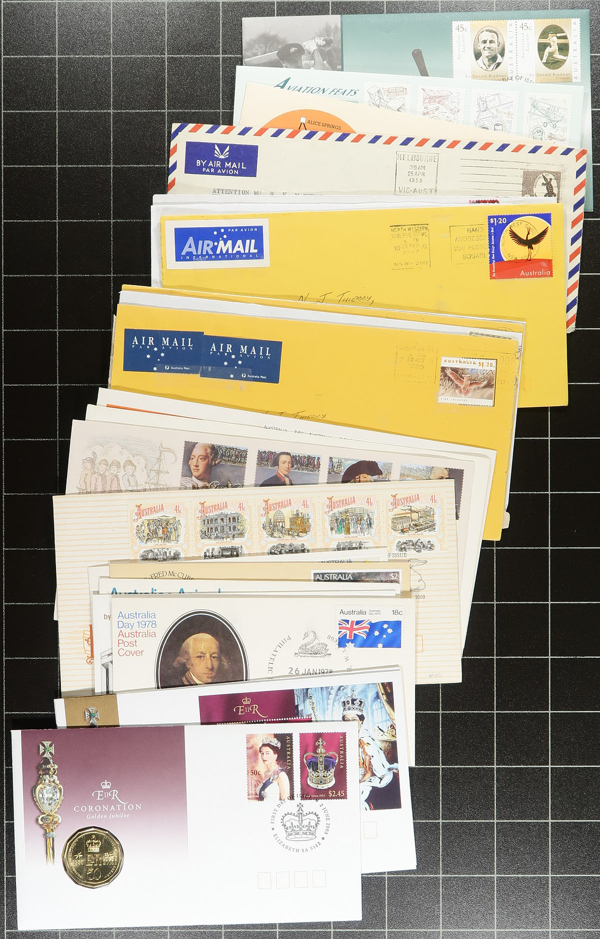 Group of roughly 200 Australia first day covers, 1940-2000's, noting singles, sets, souvenir sheets, and high denomination frankings. Also encountered were a few numismatic covers, and a few interesting bookmarks with first day cover cancellations. A nice lot for cover, topical, and thematic collectors, noting several suitable subjects with colourful cachets. A few corner bends on a few covers, overall fine to very fine. Estimate =