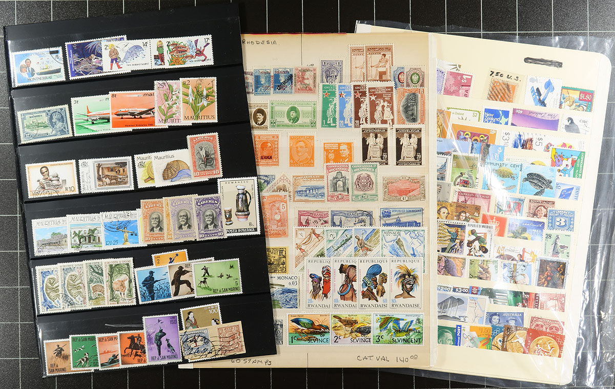 Nice accumulation of primarily used worldwide stamps, 1870's-1990's, containing roughly 1,500 stamps on over 30 stock or album pages. A cursory check indicated singles, and a few sets, with better representation from European countries, along with British Commonwealth and a few other areas, noting some material cataloguing $10 and up. Some of the material has been identified using Scott numbers, with a 2015 catalogue value totaling US$1,373.00. A nice lot for the worldwide collector looking to fill spaces, with online photos showing an overview, overall fine to very fine. Estimate =