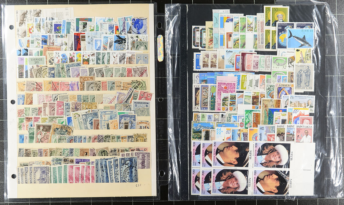 Nice accumulation of primarily used worldwide stamps, 1870's-1990's, containing roughly 1,500 stamps on over 30 stock or album pages. A cursory check indicated singles, and a few sets, with better representation from European countries, along with British Commonwealth and a few other areas, noting some material cataloguing $10 and up. Some of the material has been identified using Scott numbers, with a 2015 catalogue value totaling US$1,373.00. A nice lot for the worldwide collector looking to fill spaces, with online photos showing an overview, overall fine to very fine. Estimate =