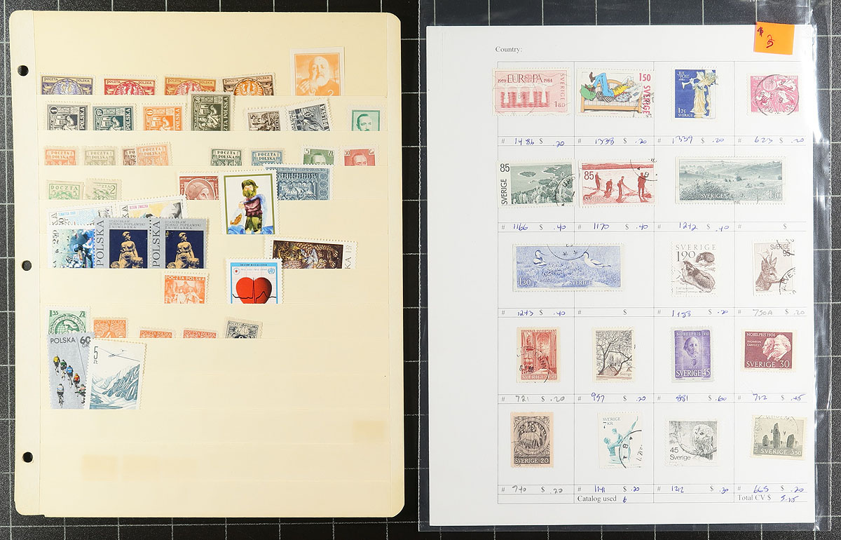 Nice accumulation of primarily used worldwide stamps, 1870's-1990's, containing roughly 1,500 stamps on over 30 stock or album pages. A cursory check indicated singles, and a few sets, with better representation from European countries, along with British Commonwealth and a few other areas, noting some material cataloguing $10 and up. Some of the material has been identified using Scott numbers, with a 2015 catalogue value totaling US$1,373.00. A nice lot for the worldwide collector looking to fill spaces, with online photos showing an overview, overall fine to very fine. Estimate =