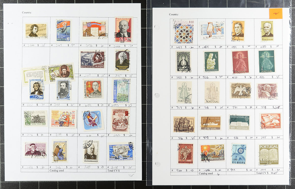 Nice accumulation of primarily used worldwide stamps, 1870's-1990's, containing roughly 1,500 stamps on over 30 stock or album pages. A cursory check indicated singles, and a few sets, with better representation from European countries, along with British Commonwealth and a few other areas, noting some material cataloguing $10 and up. Some of the material has been identified using Scott numbers, with a 2015 catalogue value totaling US$1,373.00. A nice lot for the worldwide collector looking to fill spaces, with online photos showing an overview, overall fine to very fine. Estimate =