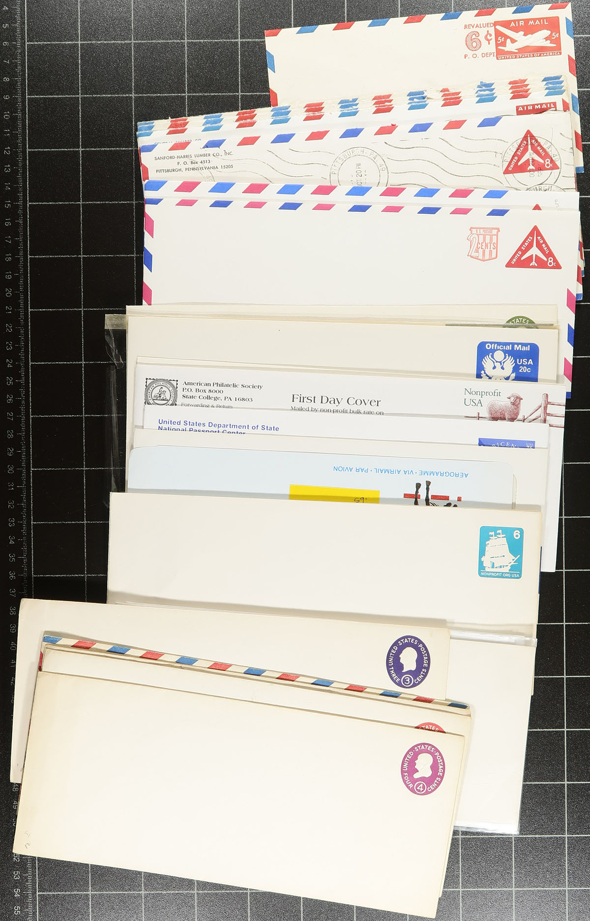 Accumulation of mint and used United States postal stationery, 1930's-1980's, containing roughly 600 items in a box. A cursory check indicated envelopes of various types and configurations, wrappers, post cards, UPU envelopes, air letters and aerogrames, etc., along with airmail, official, and non profit rates. Most of the material is within the given range but did encounter Scott #UX6 used (x2), and UY2 reply card unused, leaving other possible finds to the specialist. Also includes a bag containing several cut squares. Overall fine to very fine. Estimate =