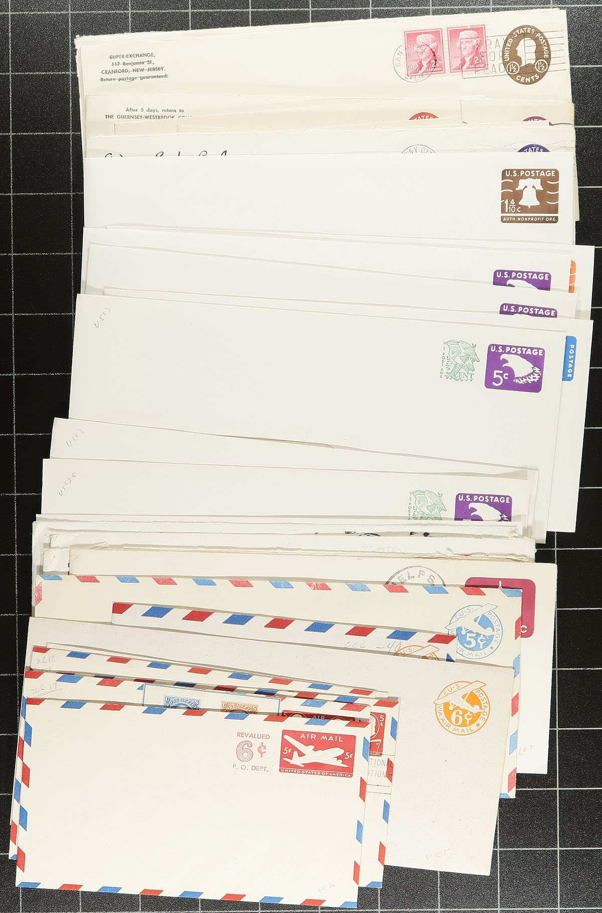 Accumulation of mint and used United States postal stationery, 1930's-1980's, containing roughly 600 items in a box. A cursory check indicated envelopes of various types and configurations, wrappers, post cards, UPU envelopes, air letters and aerogrames, etc., along with airmail, official, and non profit rates. Most of the material is within the given range but did encounter Scott #UX6 used (x2), and UY2 reply card unused, leaving other possible finds to the specialist. Also includes a bag containing several cut squares. Overall fine to very fine. Estimate =