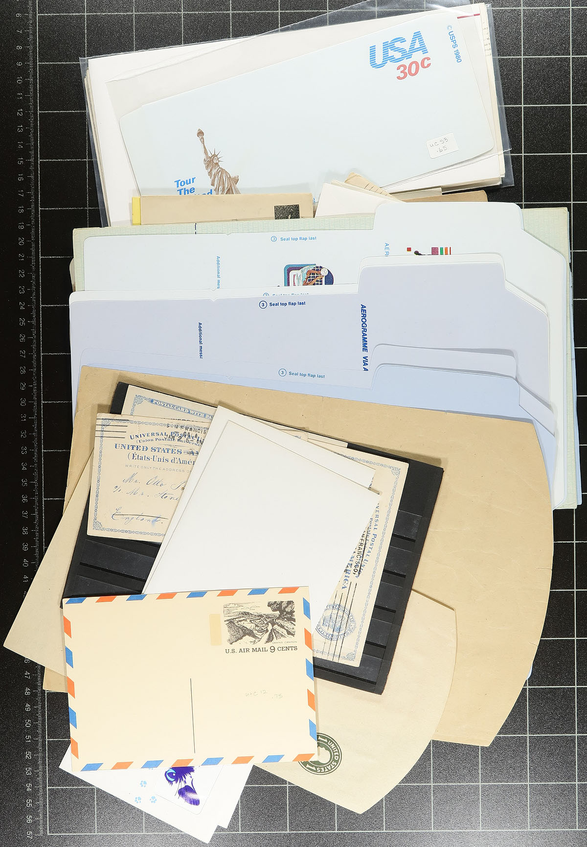 Accumulation of mint and used United States postal stationery, 1930's-1980's, containing roughly 600 items in a box. A cursory check indicated envelopes of various types and configurations, wrappers, post cards, UPU envelopes, air letters and aerogrames, etc., along with airmail, official, and non profit rates. Most of the material is within the given range but did encounter Scott #UX6 used (x2), and UY2 reply card unused, leaving other possible finds to the specialist. Also includes a bag containing several cut squares. Overall fine to very fine. Estimate =