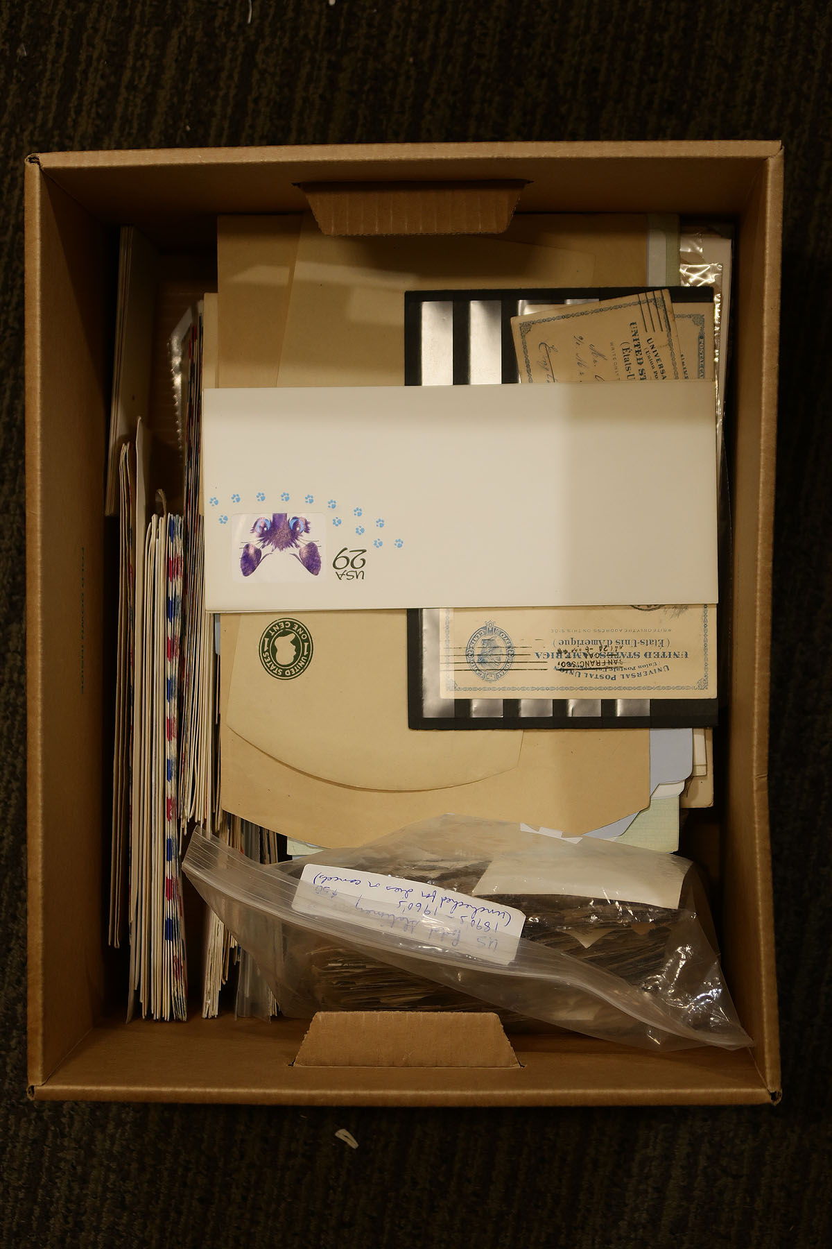 Accumulation of mint and used United States postal stationery, 1930's-1980's, containing roughly 600 items in a box. A cursory check indicated envelopes of various types and configurations, wrappers, post cards, UPU envelopes, air letters and aerogrames, etc., along with airmail, official, and non profit rates. Most of the material is within the given range but did encounter Scott #UX6 used (x2), and UY2 reply card unused, leaving other possible finds to the specialist. Also includes a bag containing several cut squares. Overall fine to very fine. Estimate =
