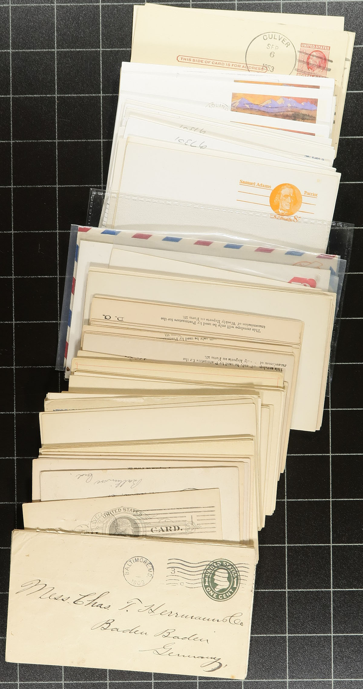 Accumulation of mint and used United States postal stationery, 1930's-1980's, containing roughly 600 items in a box. A cursory check indicated envelopes of various types and configurations, wrappers, post cards, UPU envelopes, air letters and aerogrames, etc., along with airmail, official, and non profit rates. Most of the material is within the given range but did encounter Scott #UX6 used (x2), and UY2 reply card unused, leaving other possible finds to the specialist. Also includes a bag containing several cut squares. Overall fine to very fine. Estimate =