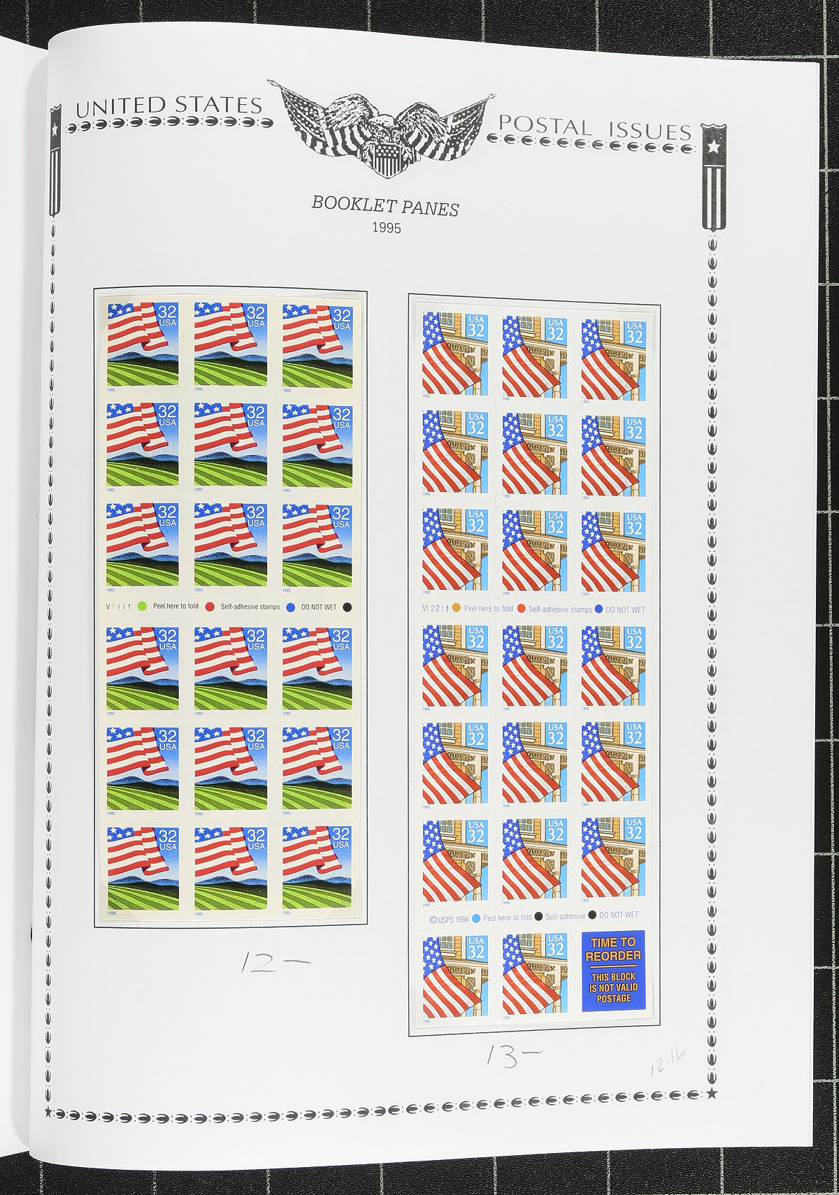 Nice group of never hinged unfolded United States booklet panes, 1992-1995, ranging from Scott #2489a/2919a, neatly mounted on album pages. Unfolded panes were only available through the philatelic service. Owner's 2006 Scott US Specialised catalogue value for the collection totals US$402.00, face value alone totals roughly US$160.00. A nice lot for all collectors, overall very fine. Estimate =
