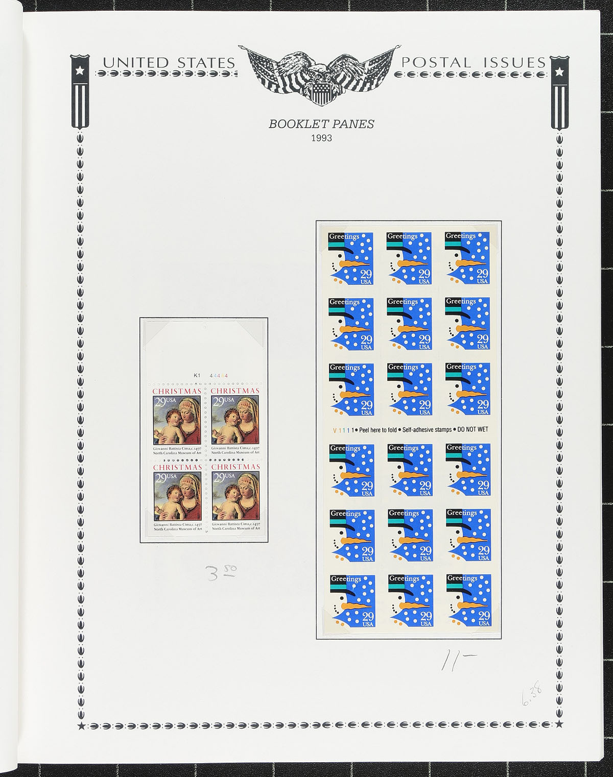 Nice group of never hinged unfolded United States booklet panes, 1992-1995, ranging from Scott #2489a/2919a, neatly mounted on album pages. Unfolded panes were only available through the philatelic service. Owner's 2006 Scott US Specialised catalogue value for the collection totals US$402.00, face value alone totals roughly US$160.00. A nice lot for all collectors, overall very fine. Estimate =