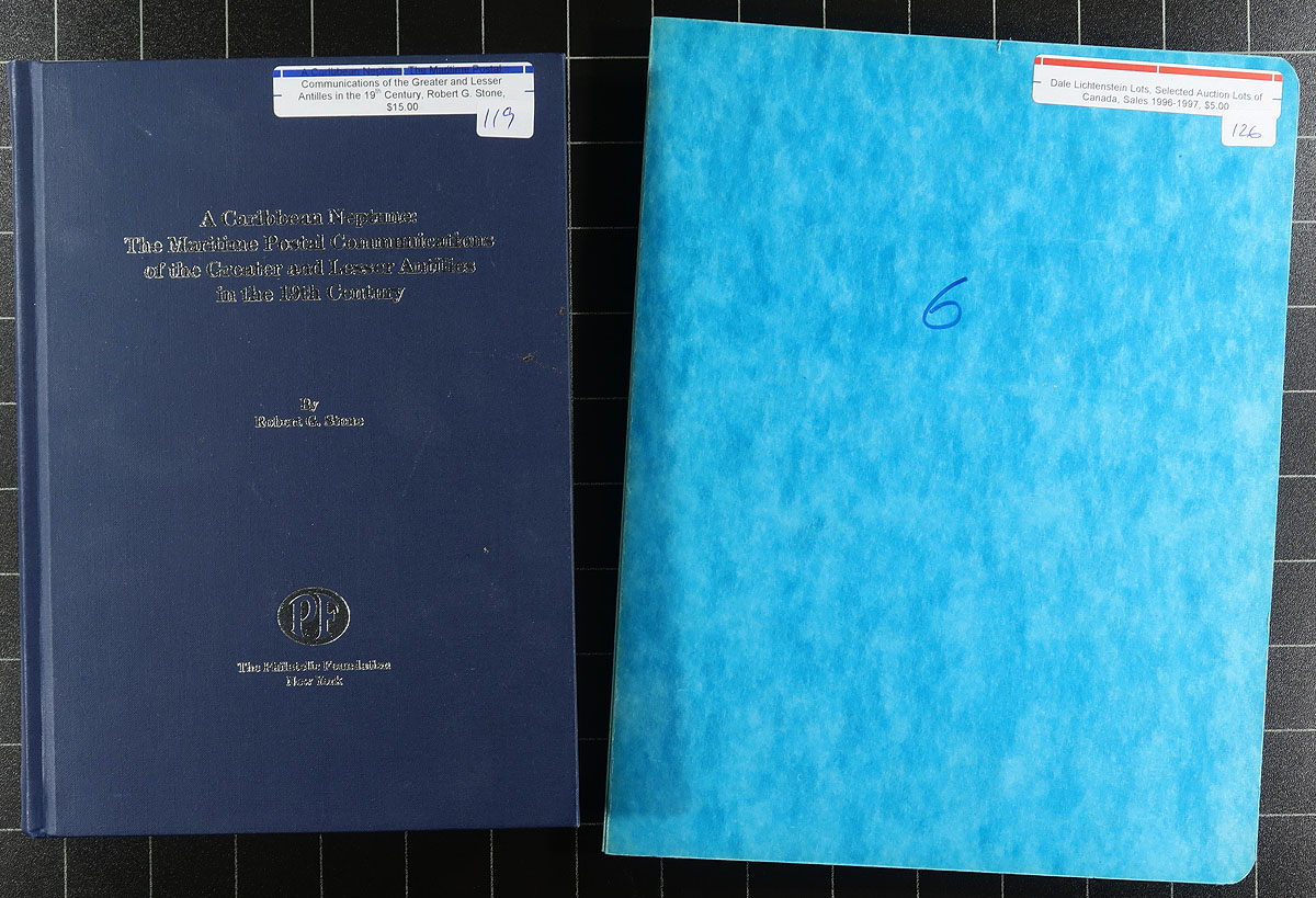 A "not your usual" mostly early Canadian philatelic reference book offering, featuring a dozen books, auction catalogues and a couple photocopy tomes. Includes (in no particular order), 1) Harmers 1982 Canadian Pence Issue Covers auction sale. 2) Sissons Auction Catalogues x2, both 1959 featuring Canada Pence, BNA, British Empire. 3) Firby Auction 2007 Warren Wilkinson 1851-1859 Postal Rates collection. 4) "The Mediterranean Mails" (PSSC Toronto published). 5) "A Caribbean Neptune, The Maritime Postal Communications of the Greater and Lesser Antilles in the 19th Century" hardbound. 6) Cross Border Mails, USA and BNA 1988 Philatelic Classics Society. 7) Stanley Gibbons Auction 1980 Simpson Small Queens. 8) Canadian Postal Stamps and Stationery (Clifton Howes, Quarterman Reprint). 9) Mattew Bennett Auction 2004 BNA Cross Border Mail. 10) P&O Bombay and Australian Liens 1852-1914 Volume 1&2 (photocopies). 11) Dale Lictenstein Lots, Selected Auction Lots of Canada Sales 1996-1997. Many of these can be hard to find if you are looking for them! Estimate =