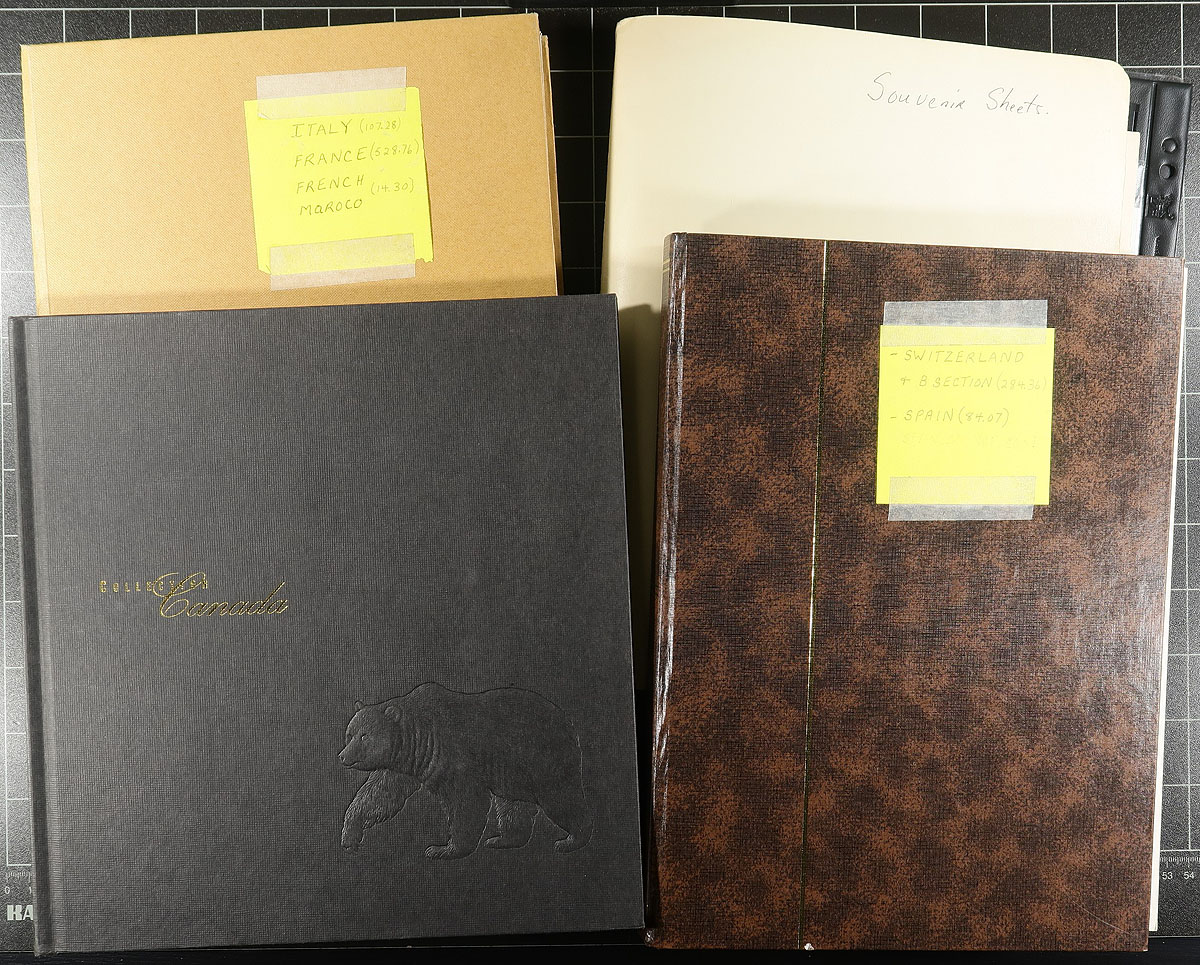 A "double height pizza box" filled with an array of philatelic treasures. Noted (in no particular order). 1) File folder with about 250 souvenir sheets, miniature panes and a couple booklets, mostly mint NH, from across the globe. 2) Stockbook with mint and used Switzerland (owner's cat $284.36) and Spain ($84.07), and by the catalogue prices, we can tell this must be an older catalogue. 3) Stockbook with Italy, France and French Morrocco (plus some oddballs, like New Guinea and Vietnam, Afghanistan etc), reported catalogue value over $650.00. 4) Canada 1997 Hardbound Annual Collection (this one featured / includes the $8.00 Grizzly). Estimate =