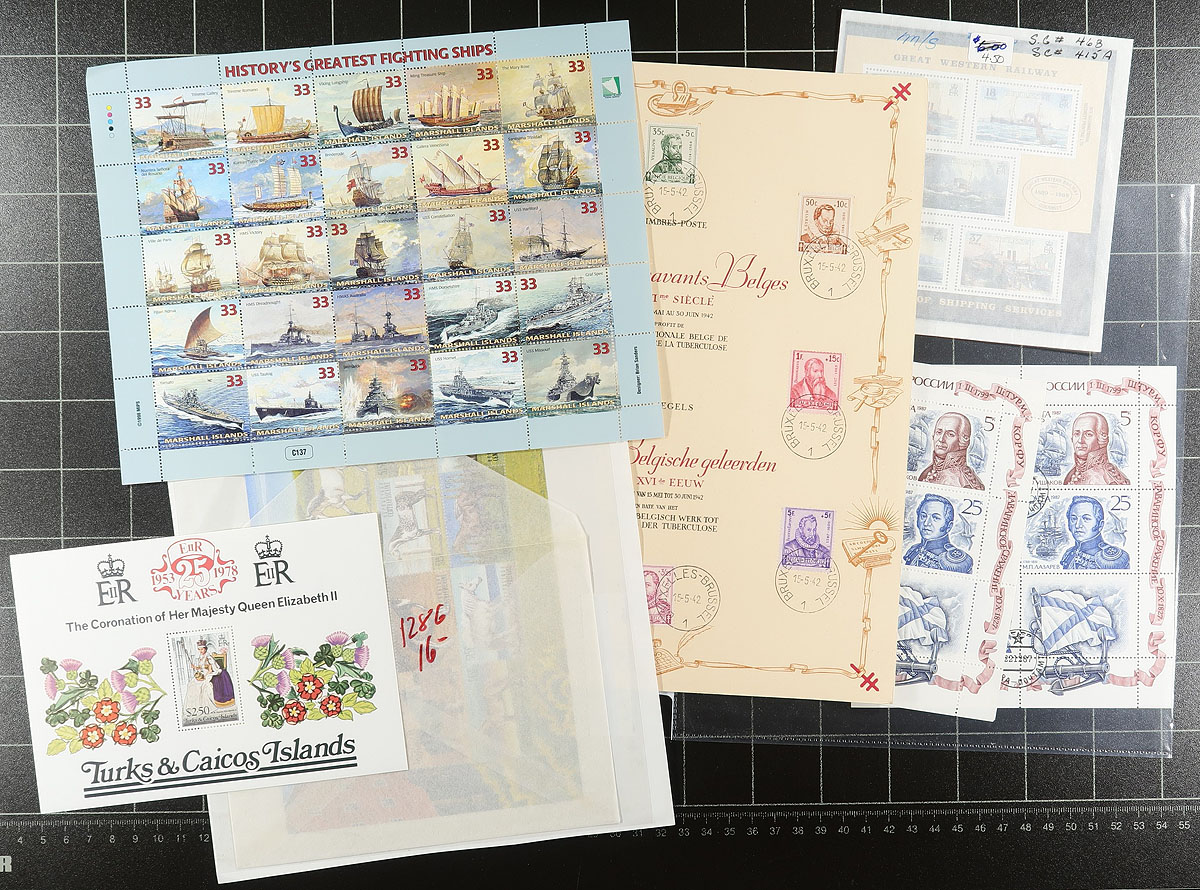 A "double height pizza box" filled with an array of philatelic treasures. Noted (in no particular order). 1) File folder with about 250 souvenir sheets, miniature panes and a couple booklets, mostly mint NH, from across the globe. 2) Stockbook with mint and used Switzerland (owner's cat $284.36) and Spain ($84.07), and by the catalogue prices, we can tell this must be an older catalogue. 3) Stockbook with Italy, France and French Morrocco (plus some oddballs, like New Guinea and Vietnam, Afghanistan etc), reported catalogue value over $650.00. 4) Canada 1997 Hardbound Annual Collection (this one featured / includes the $8.00 Grizzly). Estimate =